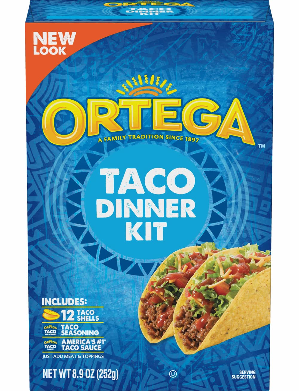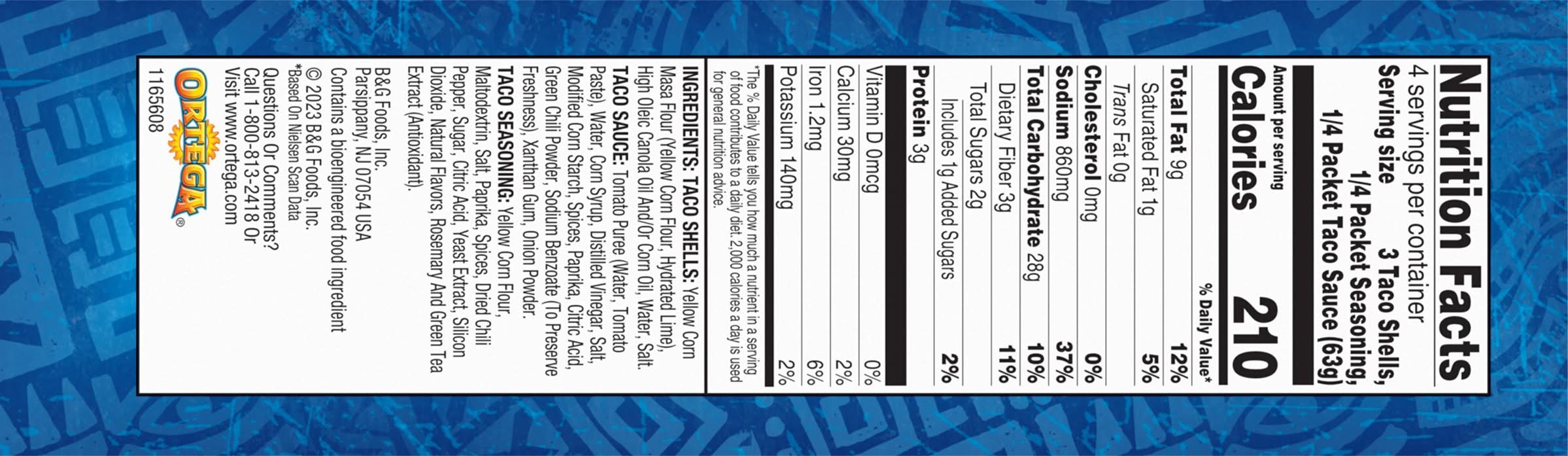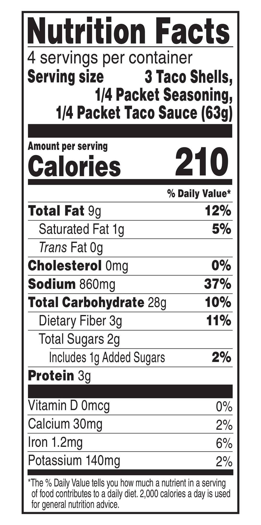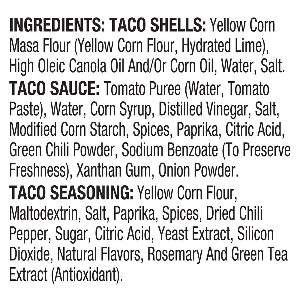 Ingredients: Taco Shells: Yellow Corn Masa Flour (Yellow Corn Flour, Hydrated Lime), High Oleic Canola Oil and/or Corn Oil, Water, Salt. Taco Sauce: Tomato Puree (Water, Tomato Paste), Water, Corn Syrup, Distilled Vinegar, Salt, Modified Corn Starch, Spices, Paprika, Citric Acid, Green Chili Powder, Sodium Benzoate (to Preserve Freshness), Xanthan Gum, Onion Powder. Taco Seasoning: Yellow Corn Flour, Salt, Maltodextrin, Paprika, Spices, Dried Chili Pepper, Sugar, Citric Acid, Yeast Extract, Silicon Dioxide, Natural Flavors, Rosemary and Green Tea Extract (Antioxidant) Contains: Corn