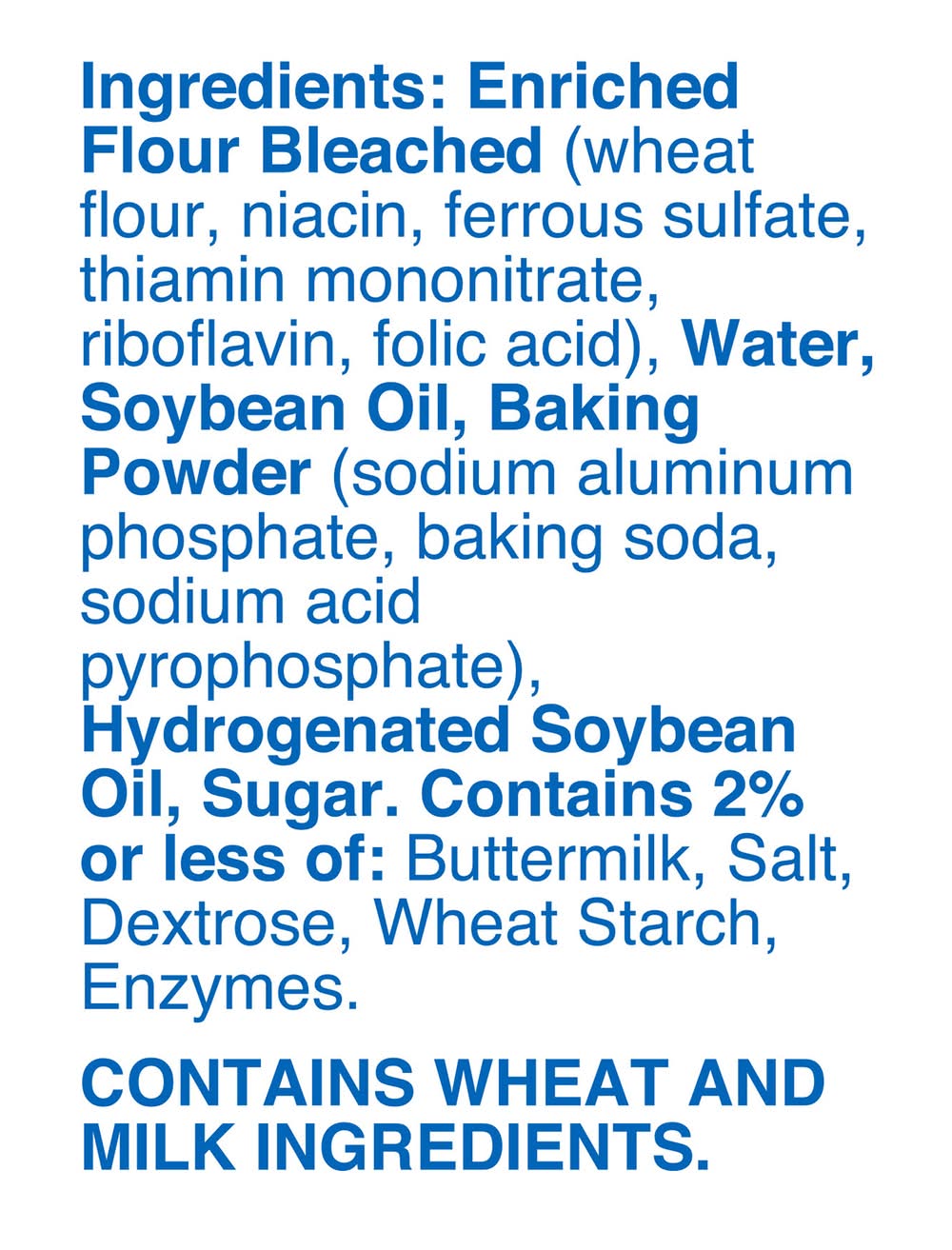 Ingredients: Enriched Flour Bleached (Wheat Flour, Niacin, Ferrous Sulfate, Thiamin Mononitrate, Riboflavin, Folic Acid), Water, Soybean Oil, Baking Powder (Sodium Aluminum Phosphate, Baking Soda, Sodium Acid Pyrophosphate), Hydrogenated Soybean Oil, Sugar, Contains 2% or Less of: Buttermilk, Salt, Dextrose, Wheat Starch, Enzymes Contains: Wheat, Milk, Soybeans