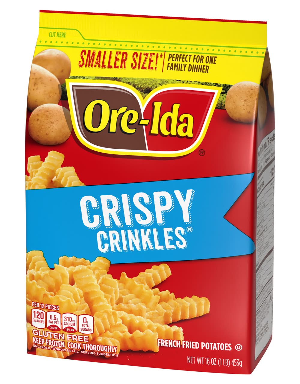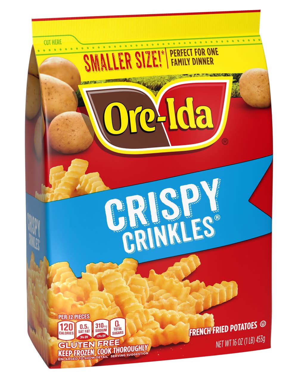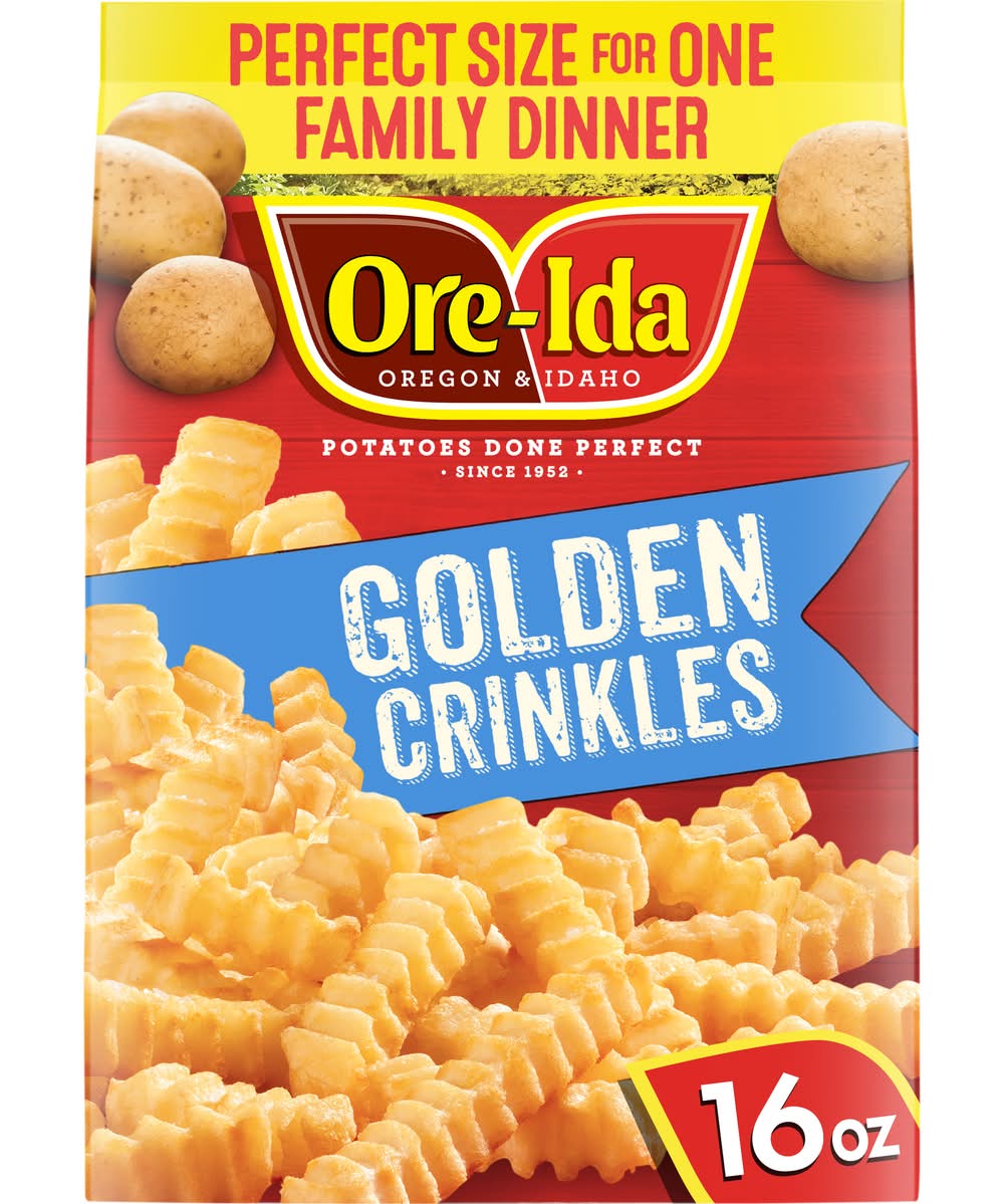 Ore-Ida Golden Crinkles French Fried Potatoes make it easy to enjoy delicious fries at home. Crispy and golden, our fries are made from freshly peeled potatoes. Our gluten-free fries offer a crispy crinkle cut outside and a fluffy inside for a tasty blend of textures to make your next family meal a success. Toss our frozen fries on a baking sheet and bake in the oven according to package instructions for perfect, golden fries. An American classic, our crinkle fries are also ideal for dipping. Serve up the traditional burger and fries, or get creative with loaded fries topped with cheese and bacon. Each 16 oz bag of crinkle cut fries is sealed to lock in flavor and contains about 5 servings, perfect for one family dinner. Flavor: Cheesy