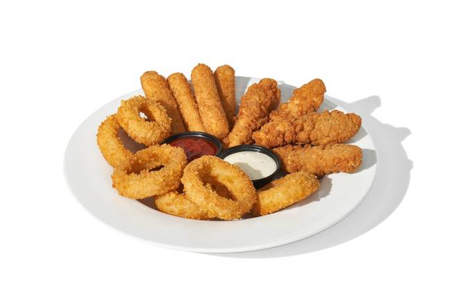 Four perfectly crispy & melty Mozzarella cheese sticks, Onions Rings & four Buttermilk Crispy Chicken Breast Strips made with all-natural chicken. Served with marinara & choice of honey mustard, ranch or IHOP® Sauce.