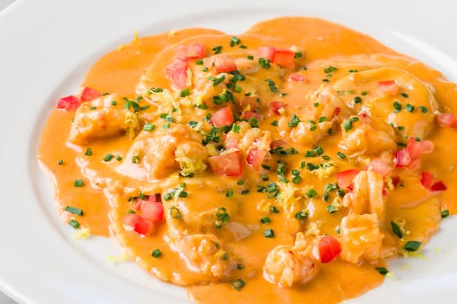 maine lobster, scallop & shrimp ravioli | leeks shrimp | tomatoes | lobster-cream sauce