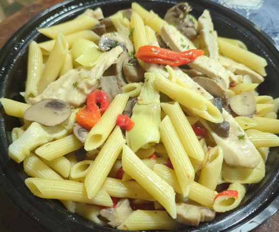 LIGHT AMARETTO CREAM SAUCE WITH SLICED TOASTED ALMONDS. SIDE OF PASTA AND SALAD