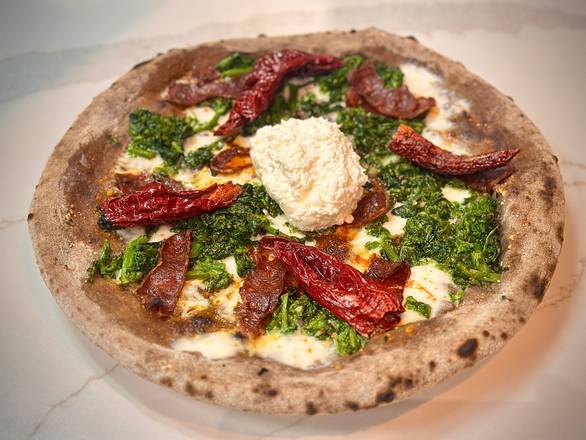 Fior di latte mozzarella, broccoli rabe, spicy cured sausage burrata, pepi cruschi