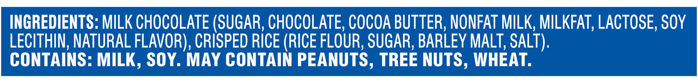 Ingredients: Milk Chocolate (Sugar, Chocolate, Cocoa Butter, Nonfat Milk, Milkfat, Lactose, Soy Lecithin, Natural Flavor), Crisped Rice (Rice Flour, Sugar, Barley Malt, Salt). Contains: Milk, Soybeans, Peanuts, Tree Nuts, Wheat, Soy