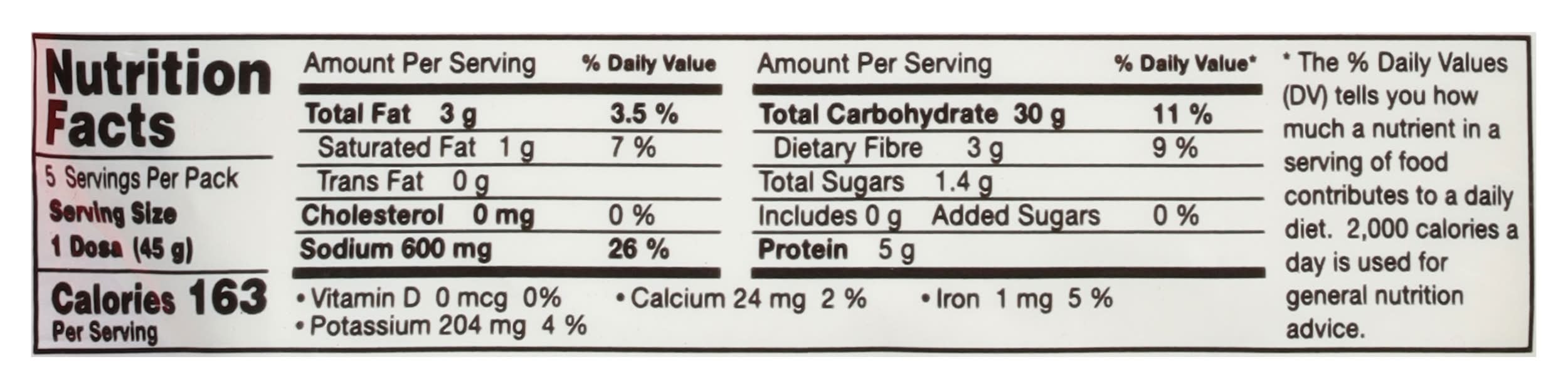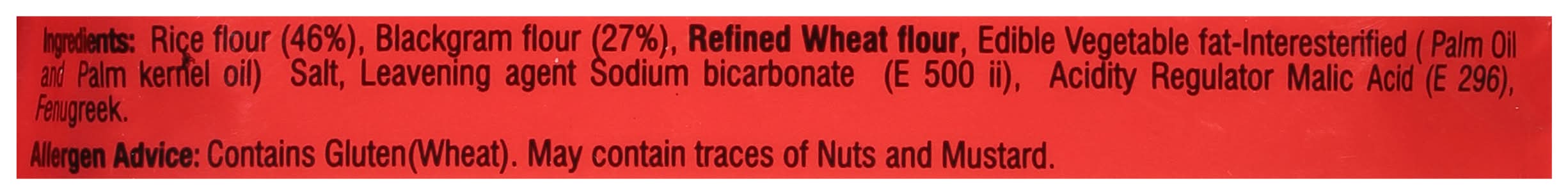Ingredients: Rice Flour (46%), Blackgram Flour (27%), Refined Wheat Flour, Edible Vegetable Fat-Interesterified (Palm Oil and Palm Kernel Oil) Salt, Leavening Agent Sodium Bicarbonate (E 500 Ii), Acidity Regulator Malic Acid (E 296), Fenugreek Contains: Gluten, Wheat, Tree Nuts, Mustard