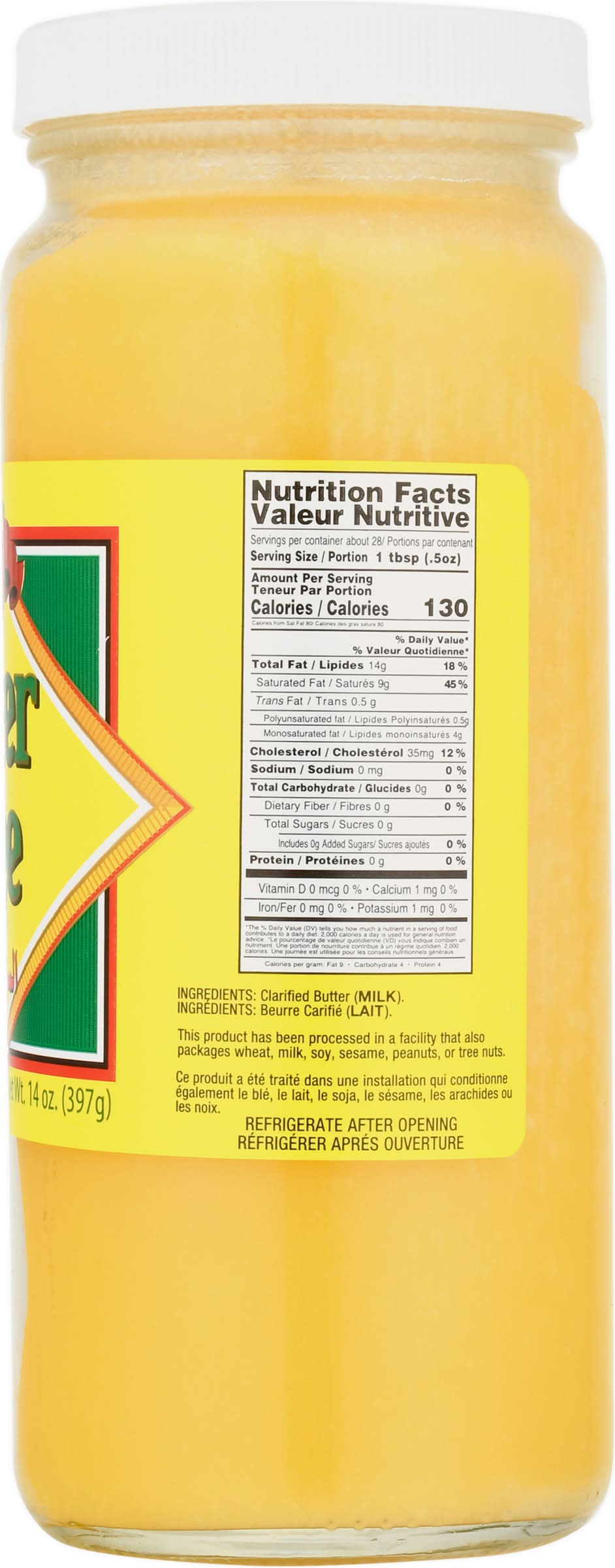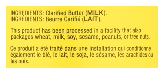Ingredients: Clarified Butter (Milk) Contains: Milk, Wheat, Milk, Soybeans, Sesame, Peanuts, Tree Nuts