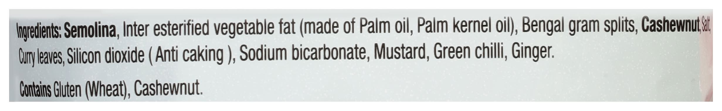 Ingredients: Semolina, Inter Esterified Vegetable Fat (Made of Palm Oil, Palm Kernel Oil), Bengal Gram Splits, Cashewnut, Salt, Curry Leaves, Silicon Dioxide (Anti Caking), Sodium Bicarbonate, Mustard, Green Chili, Ginger Contains: Gluten, Wheat, Tree Nuts, Cashews, Mustard