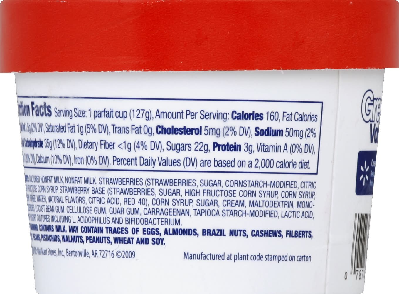 Ingredients: Cultured Nonfat Milk, Nonfat Milk, Strawberries (Strawberries, Sugar, Cornstarch-Modified, Citric Acid), High Fructose Corn Syrup, Strawberry Base (Strawberries, Sugar, High Fructose Corn Syrup, Corn Syrup, Strawberry Puree, Water, Natural Flavors, Citric Acid, Red 40), Corn Syrup, Sugar, Cream Maltodextrin, Mono- and Diglycerides, Locust Bean Gum, Cellulose Gum, Guar Gum, Carrageenan, Tapioca Starch-Modified, Lactic Acid, Live Active Yogurt Cultures Including L. Acidophilus and Bifidobacterium Contains: Milk, Eggs, Peanuts, Soybeans, Wheat