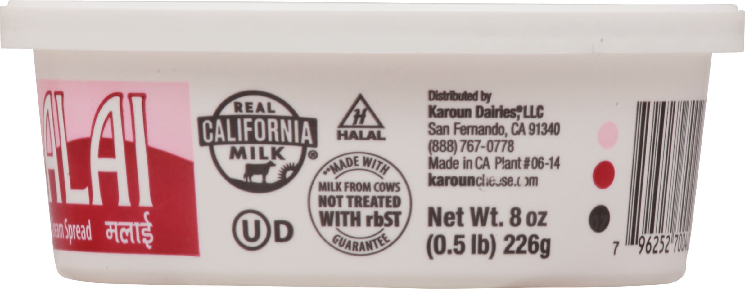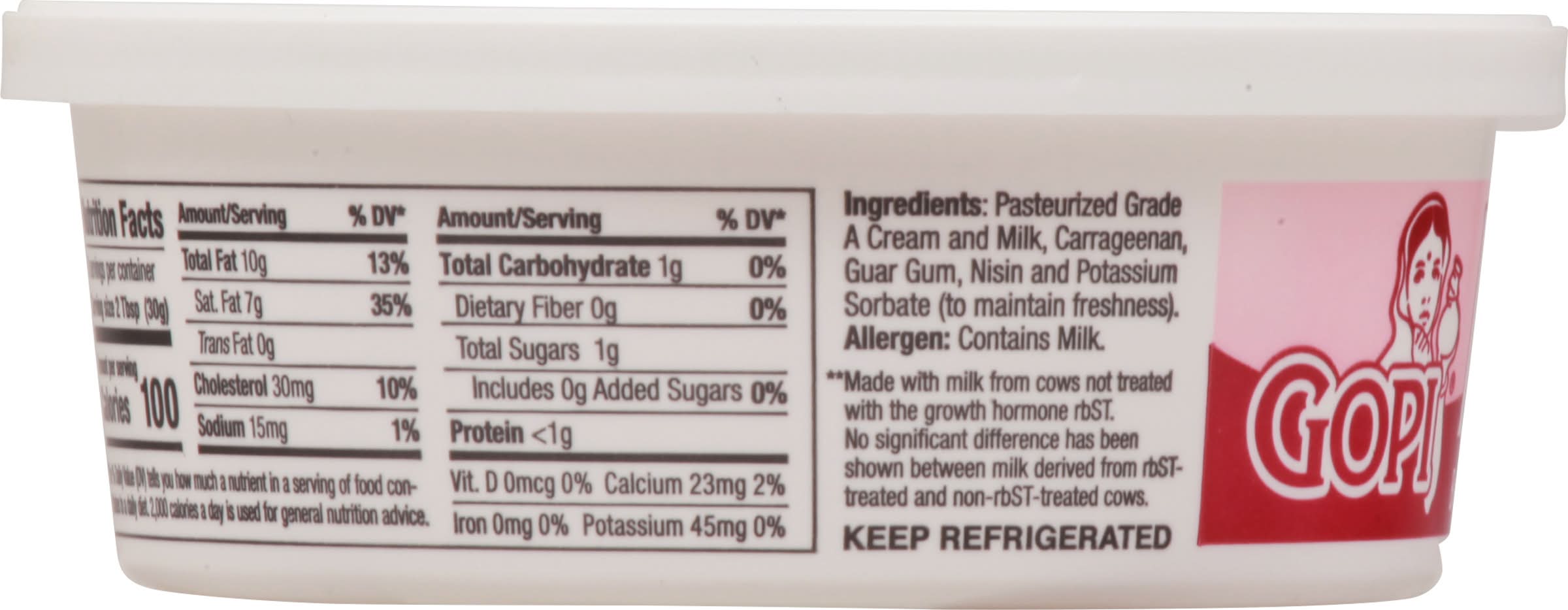 Breakfast cream spread. Halal. Real California milk. Made with milk from cows not treated with rbST guarantee (Made with milk from cows not treated with growth hormone rbst. No significant difference has been shown between milk derived from rbst-treated and non-rbst-treated cows). karouncheese.com. Made in CA. • Brand: Gopi • Size: 0.5 • kosher, halal • Number of servings: 8 • Karoun Dairies, LLC, San Fernando, CA, 91340, Ph: 1-888-767-0778 • Packaging: Reusable