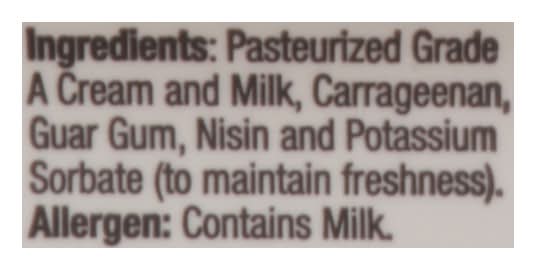 Ingredients: Pasteurized Grade A Cream and Milk, Carrageenan, Guar Gum, Nisin and Potassium Sorbate (to Maintain Freshness) Contains: Milk