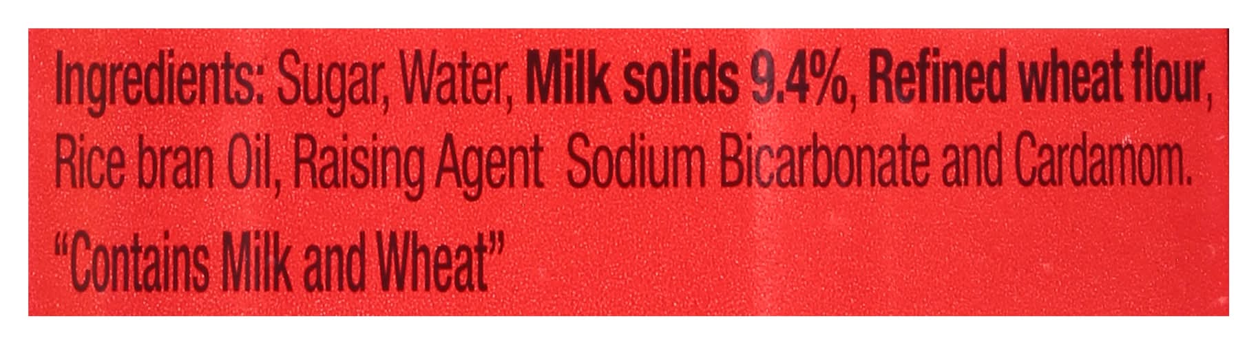Ingredients: Sugar, Water, Milk Solids 9.4%, Refined Wheat Flour, Rice Bran Oil, Raising Agent Sodium Bicarbonate and Cardamom Contains: Milk, Wheat, Soybeans, Sesame