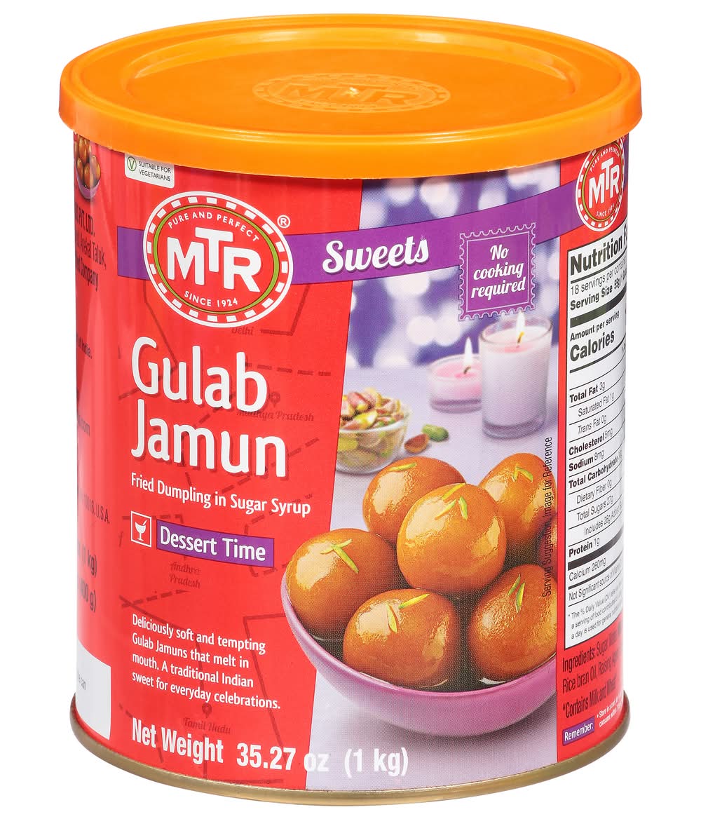 Gulab Jamuns are traditional Indian sweets known for their deliciously soft texture that melts in the mouth. These fried dumplings are soaked in sugar syrup, offering a delectable treat suitable for vegetarians. They require no cooking and are ready to be enjoyed any time, perfect for everyday celebrations. Since 1924, the recipe has been maintained to ensure a pure and perfect taste. The product is made in India. • Brand: Mtr • Size: 1 • vegetarian • Number of servings: 20 • AMTRADE, New York, NY, 10016, Ph: 212-725-0679