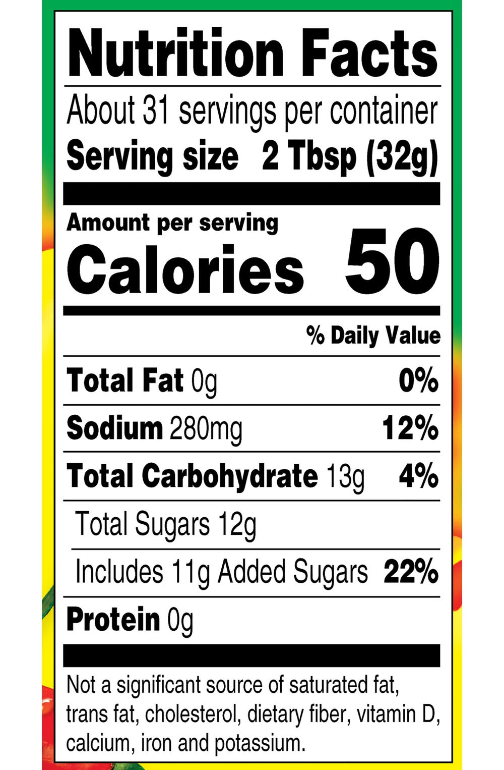 Ingredients: WATER, SUGAR, TOMATO PASTE, CHILI PUREE, SALT, AND LESS THAN 2% OF ACETIC ACID, MODIFIED CORNSTARCH, CHILI POWDER, XANTHAN GUM, GARLIC POWDER, GINGER, SODIUM ALGINATE, SODIUM BENZOATE (PRESERVATIVE), POTASSIUM IODATE.