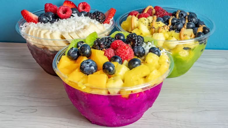 Acai base topped with granola, kiwi, mixed berries, mango, chia seeds and honey