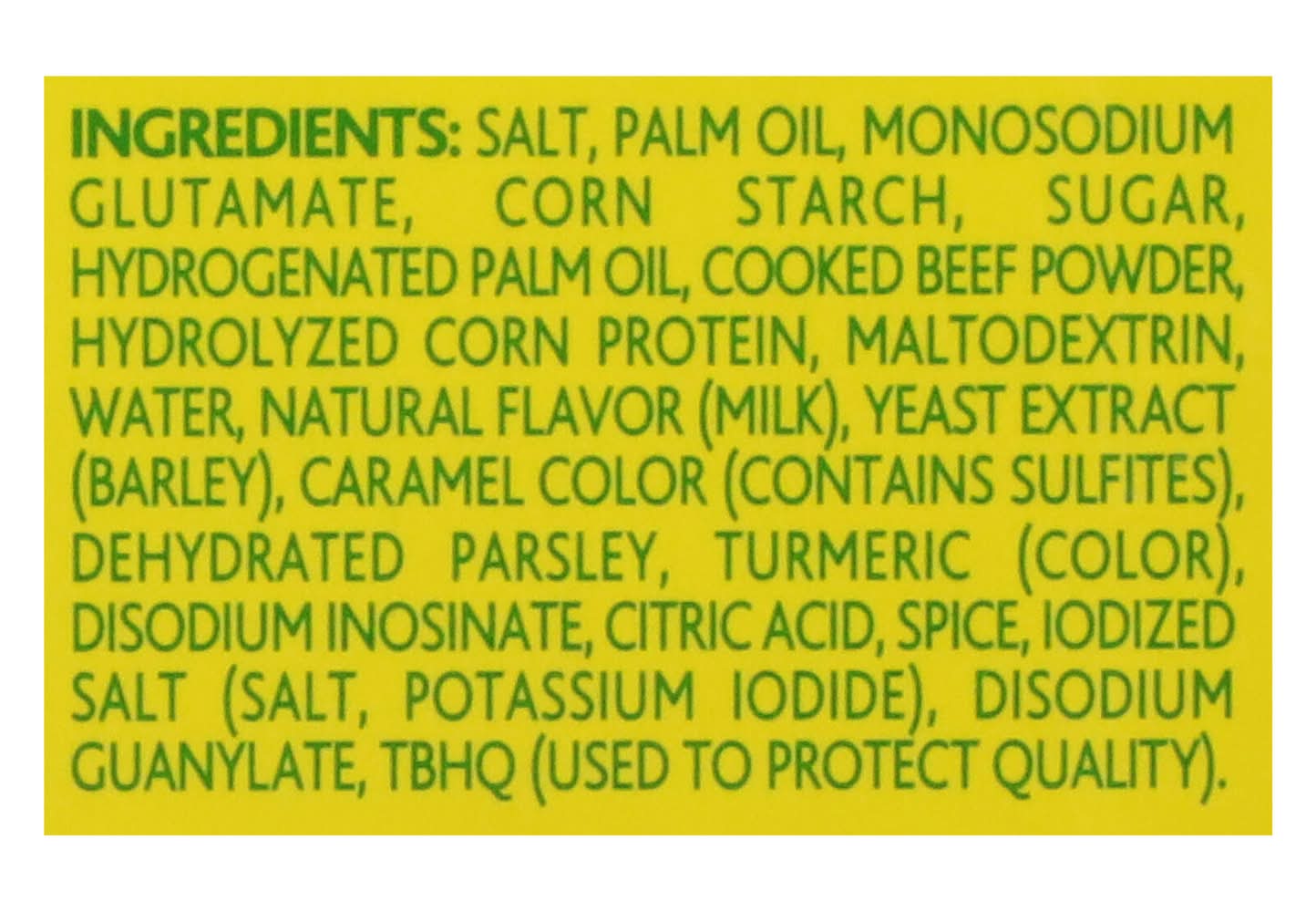Ingredients: Salt, Palm Oil Monosodium Glutamate, Corn Starch, Sugar, Hydrogenated Palm Oil, Cooked Beef Powder, Hydrolyzed Corn Protein, Maltodextrin, Water, Natural Flavor (Milk), Yeast Extract (Barley), Caramel Color (Contains Sulfites), Dehydrated Parsley, Turmeric (Color), Disodium Inosinate, Citric Acid, Spice, Iodized Salt (Salt, Potassium Iodide), Disodium Guanylate, TBHQ (Used to Protect Quality) Contains: Corn, Barley, Sulfites, Milk