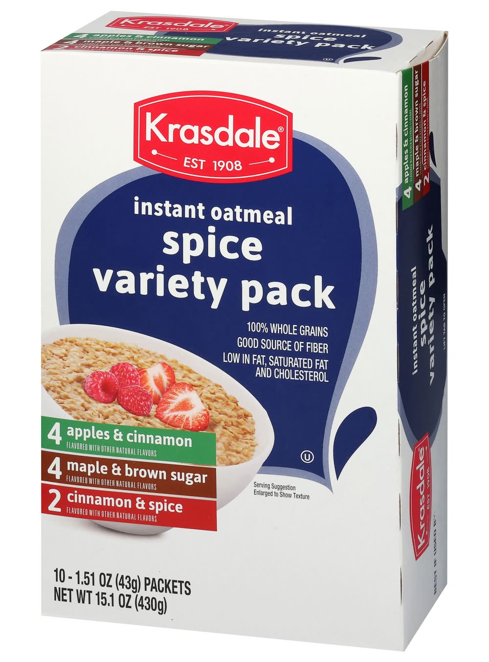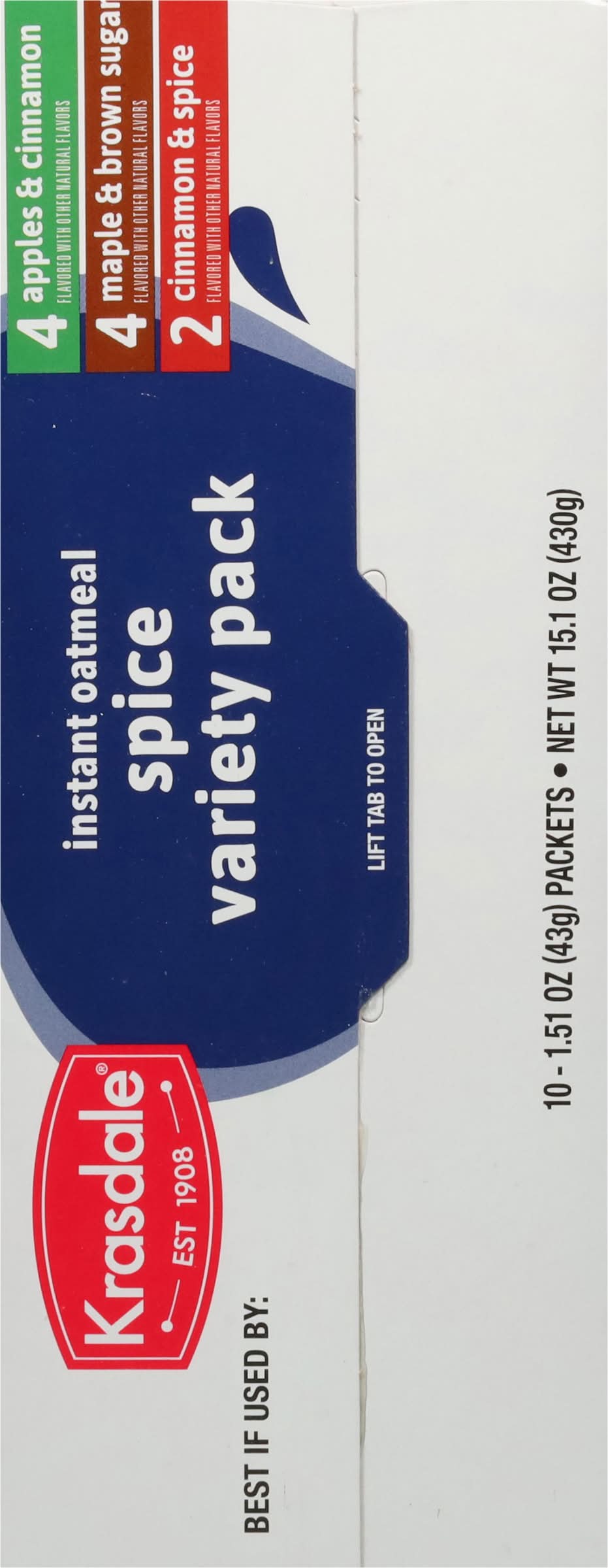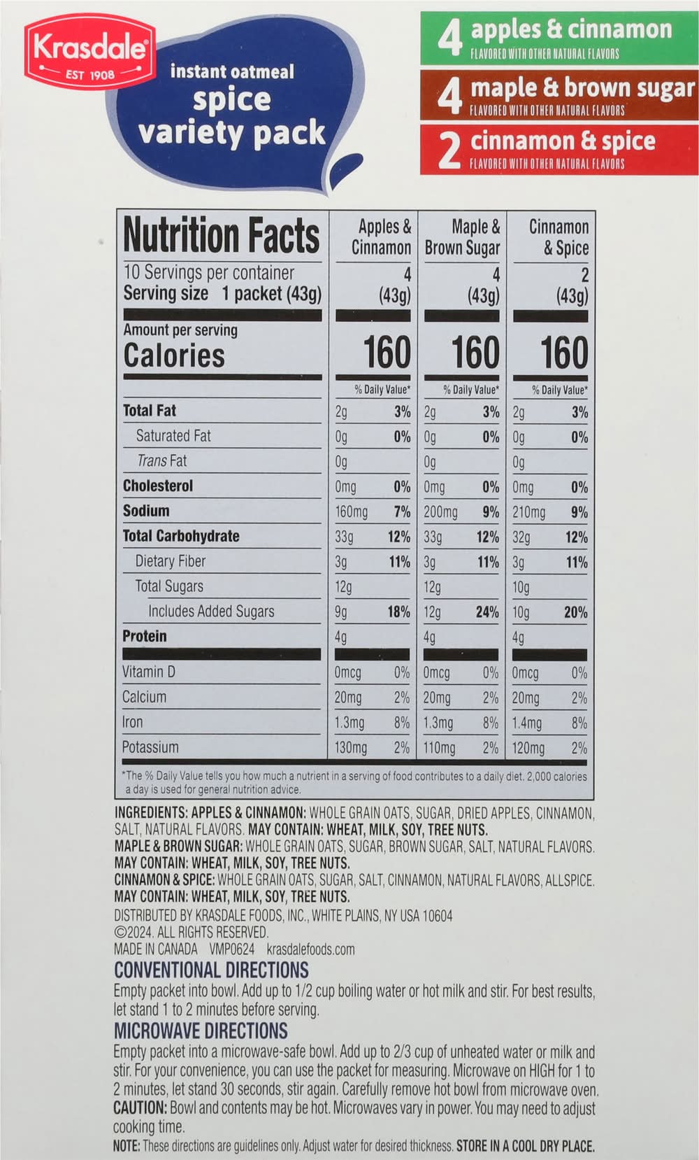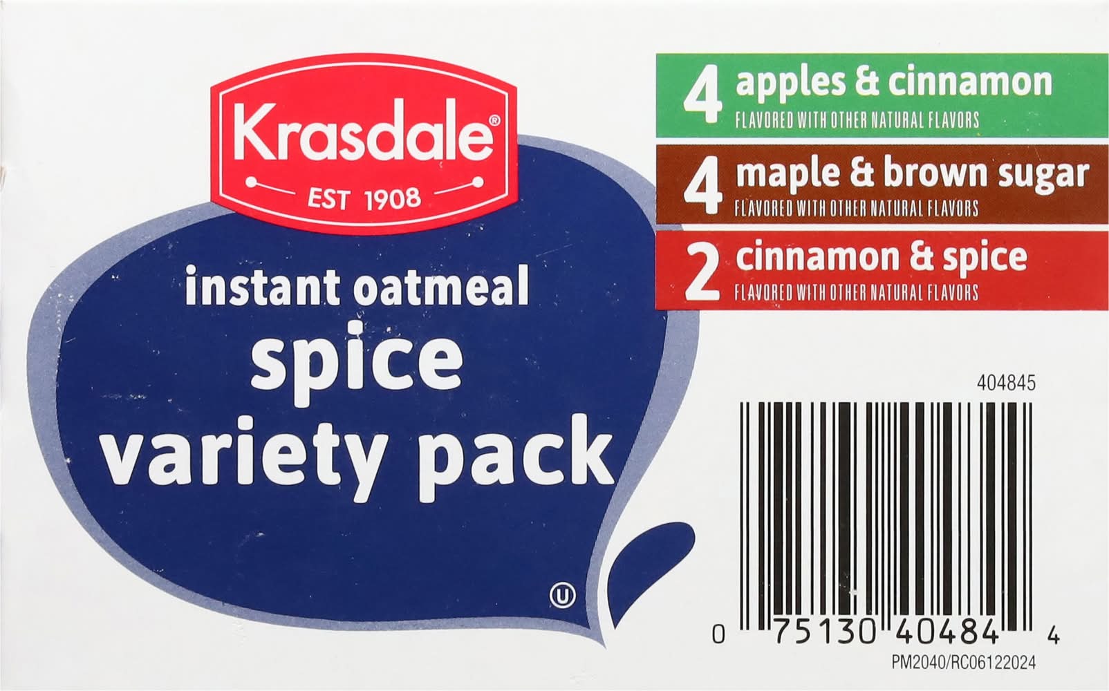 Instant Oatmeal, Spice, Variety Pack • Brand: Krasdale • Flavor: Apple & cinnamon maple & brown sugar, cinnamon & spice • Size: 15.1 • kosher