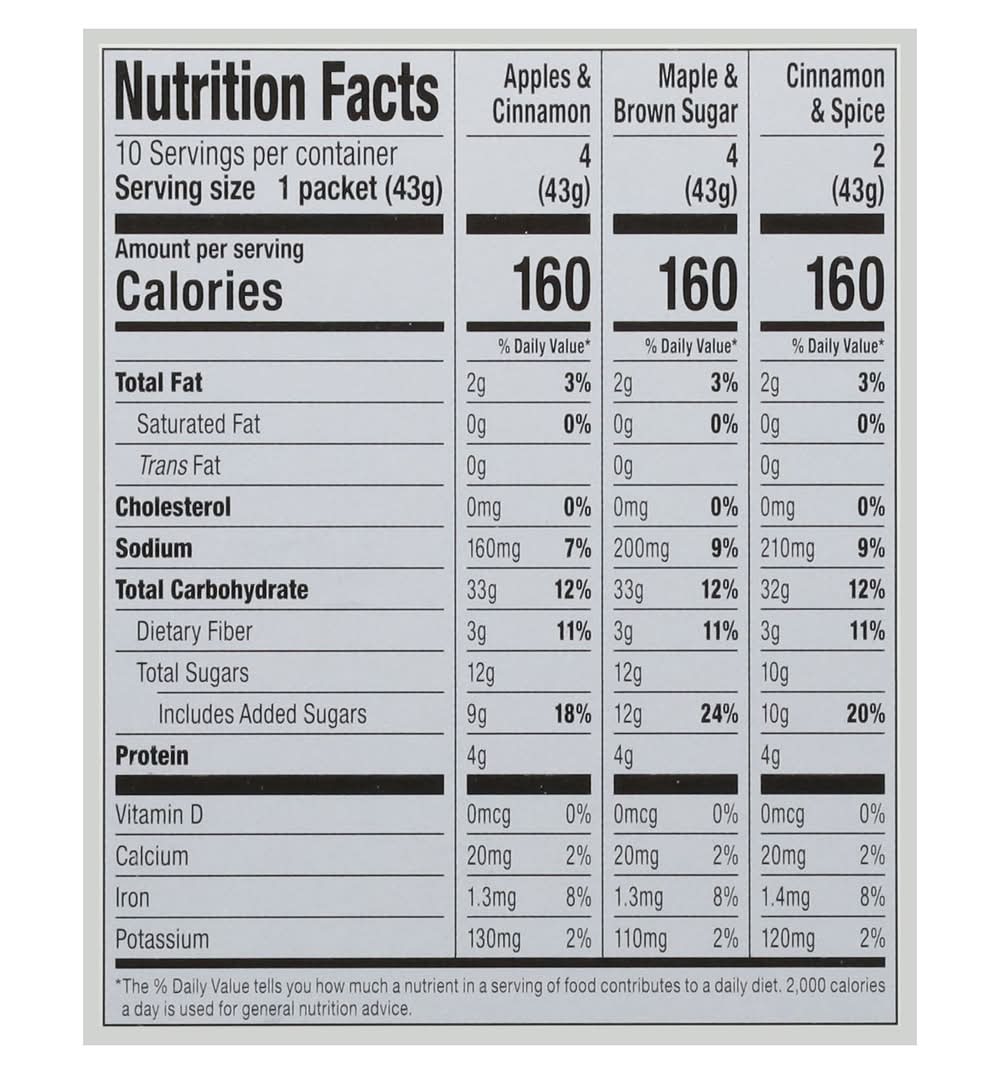 Ingredients: Apples & Cinnamon: Whole Grain Oats, Sugar, Dried Apples, Cinnamon, Salt, Natural Flavors. Maple & Brown Sugar: Whole Grain Oats, Sugar, Brown Sugar, Salt, Natural Flavors. Cinnamon & Spice: Whole Grain Oats, Sugar, Salt, Cinnamon, Natural Flavors, Allspice. Contains: Oat, Wheat, Milk, Soybeans, Tree Nuts