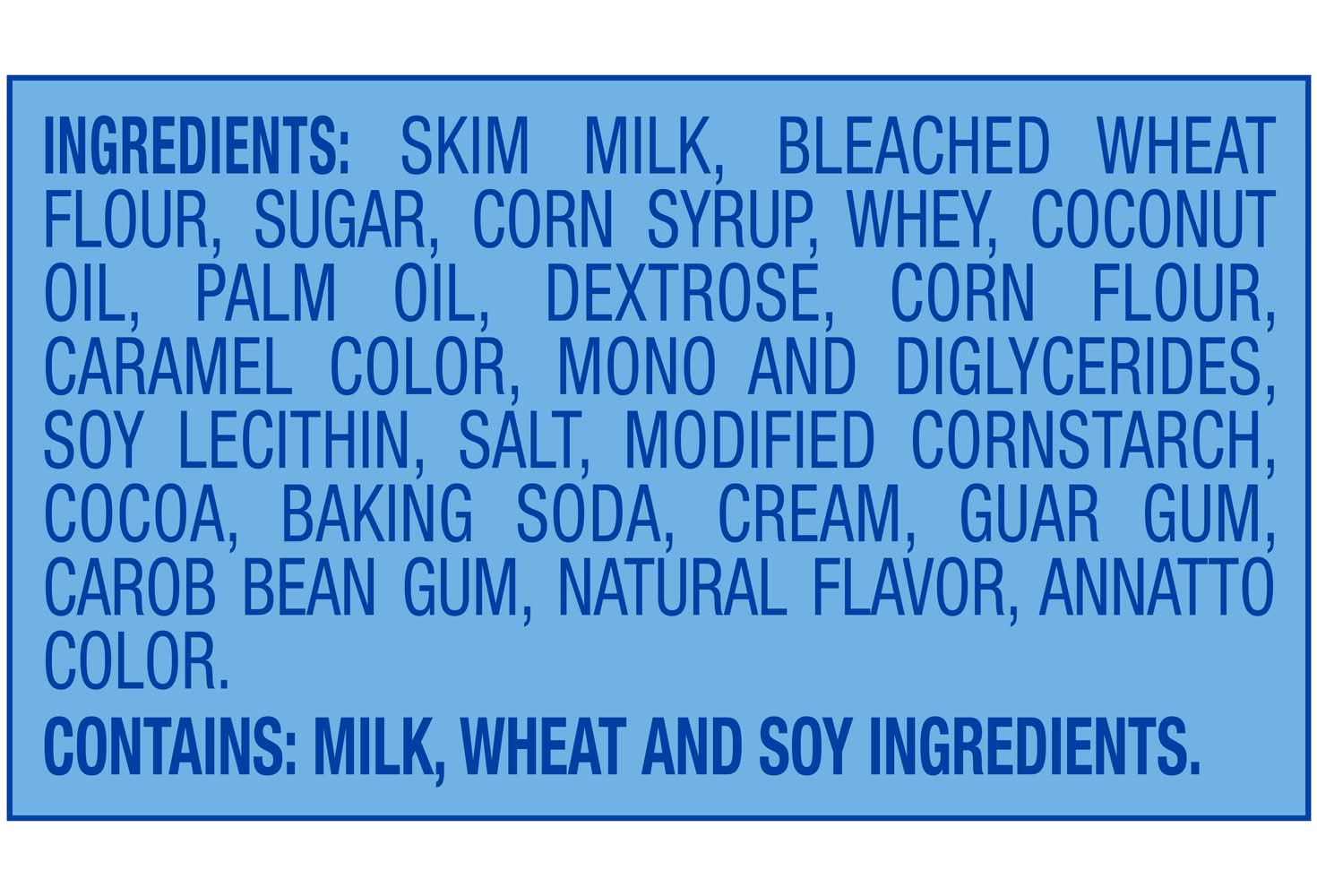 Ingredients: INGREDIENTS: DAIRY PRODUCT SOLIDS, SKIM MILK, SUGAR, CORN SYRUP, BLEACHED WHEAT FLOUR, CREAM, COCONUT OIL, MALTODEXTRIN, CORN FLOUR, DEXTROSE, PALM OIL, CARAMEL COLOR, BAKING SODA, COCOA, MODIFIED CORNSTARCH, MONO AND DIGLYCERIDES, SALT, SOY LECITHIN, PROPYLENE GLYCOL MONOSTEARATE, CELLULOSE GEL, GUAR GUM, MONOGLYCERIDES, CAROB BEAN GUM, CELLULOSE GUM, NATURAL FLAVOR, ANNATTO COLOR Contains: CONTAINS: MILK; WHEAT AND SOY INGREDIENTS.