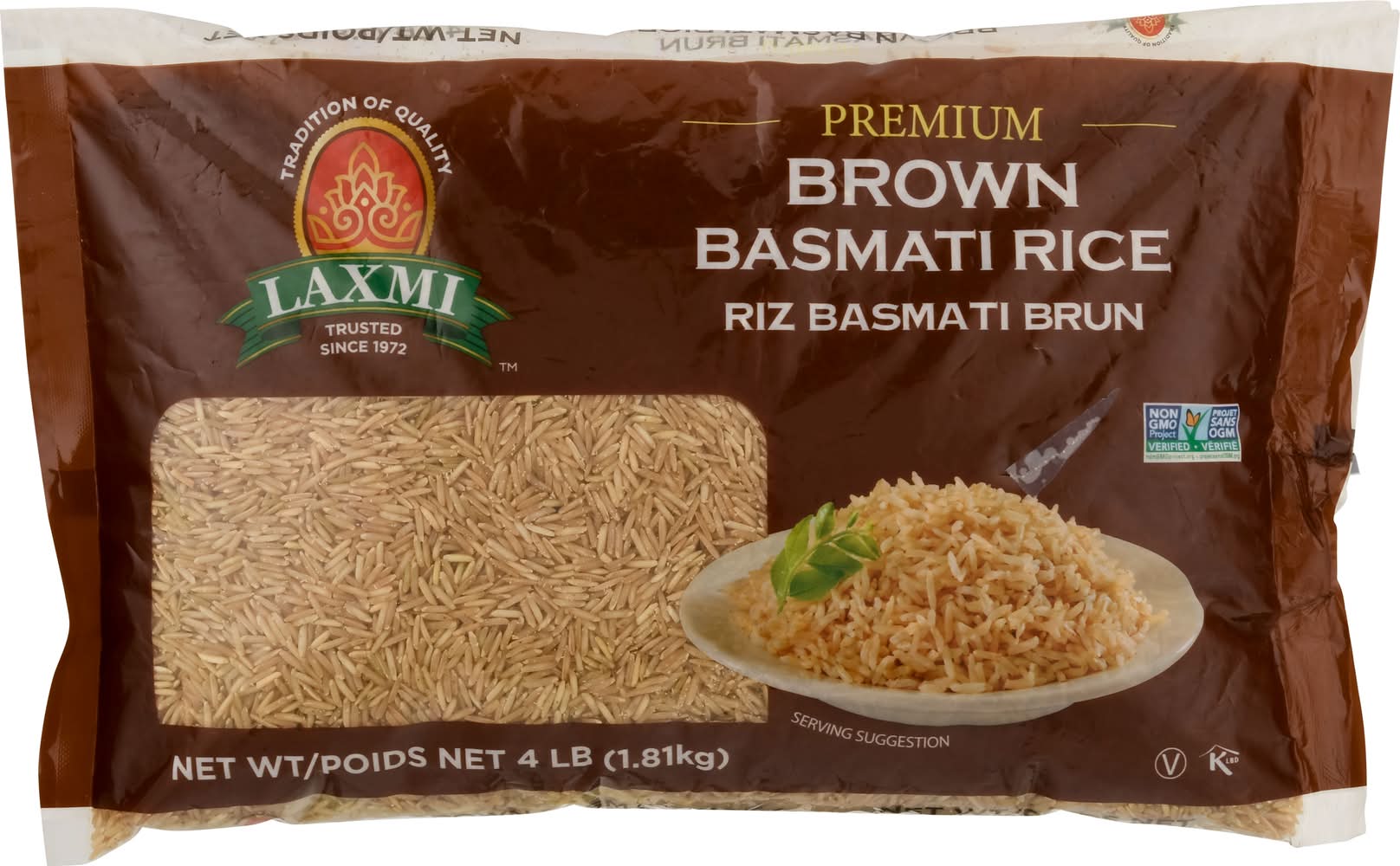 Basmati Rice, Premium, Brown • Brand: Laxmi • Flavor: Premium brown • Size: 4 • kosher, vegan, GMO-free