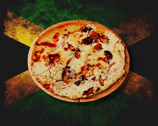 Oven baked white pizza topped with jerk chicken, red onions and mozzarella cheese.