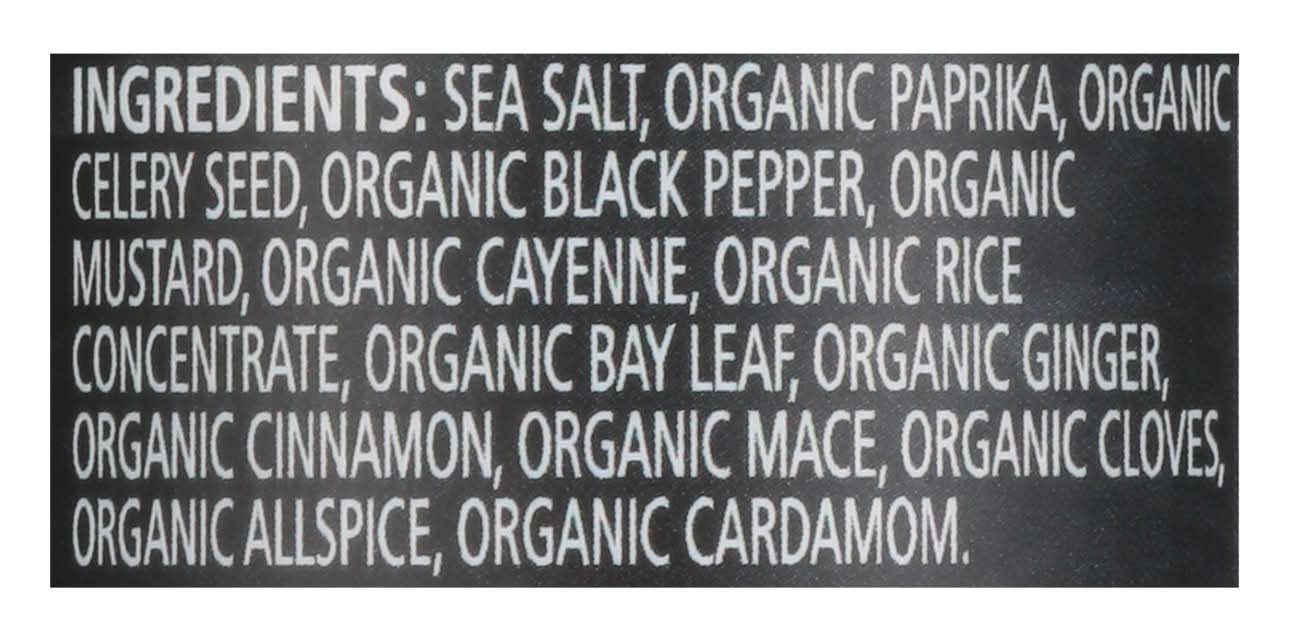 Ingredients: Sea Salt, Organic Paprika, Organic Celery Seed, Organic Black Pepper, Organic Mustard, Organic Cayenne, Organic Rice Concentrate, Organic Bay Leaf, Organic Ginger, Organic Cinnamon, Organic Mace, Organic Cloves, Organic Allspice, Organic Cardamom Contains: Mustard, Celery