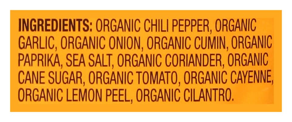 Ingredients: Organic Chili Pepper, Organic Garlic, Organic Onion, Organic Cumin, Organic Paprika, Sea Salt, Organic Coriander, Organic Cane Sugar, Organic Tomato, Organic Cayenne, Organic Lemon Peel, Organic Cilantro