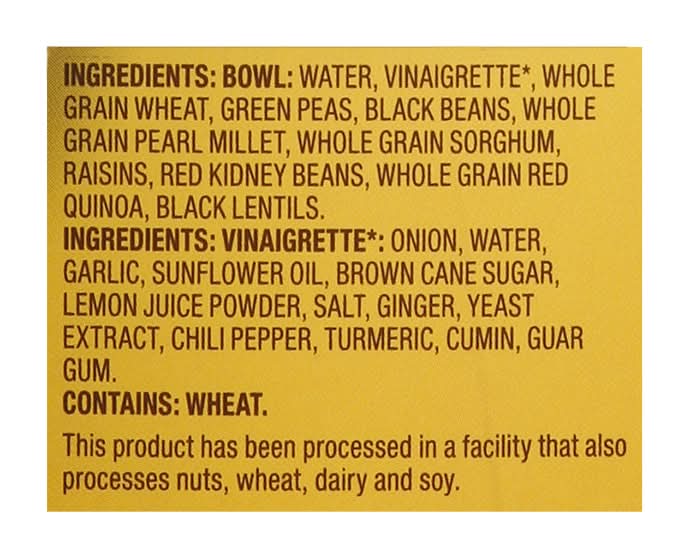 Ingredients: Bowl: Water, Vinaigrette, Whole Grain Wheat, Green Peas, Black Beans, Whole Grain Pearl Millet, Whole Grain Sorghum, Raisins, Red Kidney Beans, Whole Grain Red Quinoa, Black Lentils. Vinaigrette: Onion, Water, Garlic, Sunflower Oil, Brown Cane Sugar, Lemon Juice Powder, Salt, Ginger, Yeast Extract, Chili Pepper, Turmeric, Cumin, Guar Gum Contains: Wheat, Tree Nuts, Wheat, Milk, Soybeans