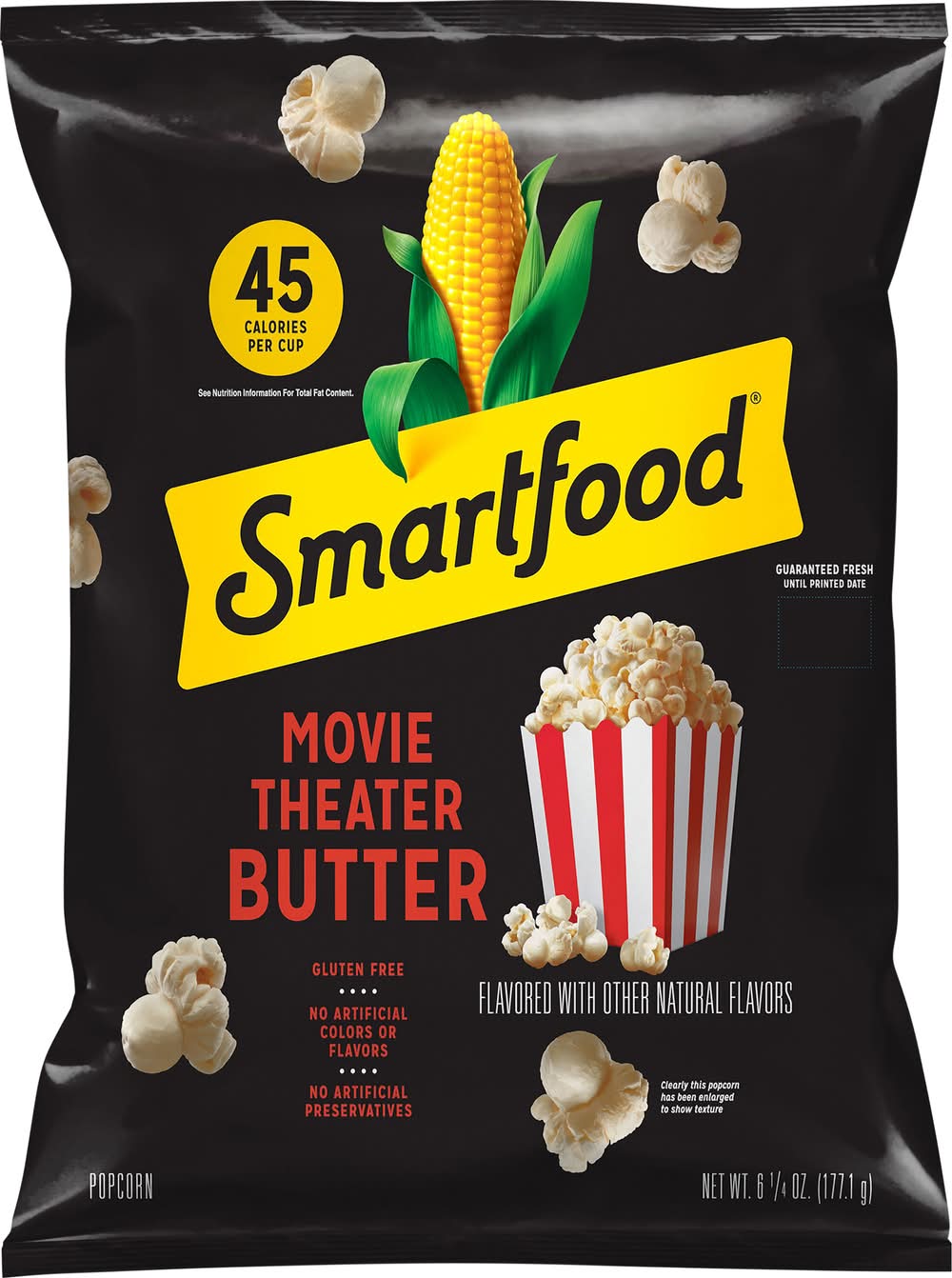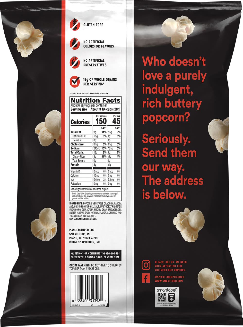 Flavored with other natural flavors. No artificial colors or flavors. 45 calories per cup. 19 g of whole grains per serving (48 g of whole grains recommended daily). Gluten free. • Flavor: Butter • Smartfoods, Inc., Plano,TX