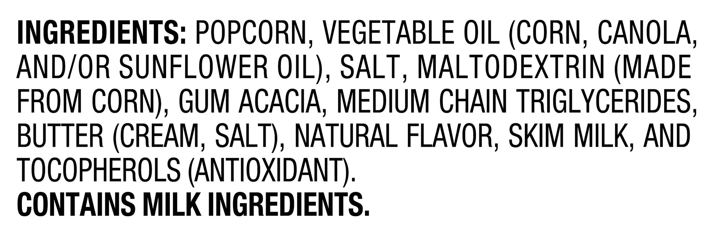 Ingredients: Popcorn, Vegetable Oil (Corn Canola and/or Sunflower Oil), Salt, Maltodextrin (Made from Corn), Gum Acacia, Medium Chain Triglycerides, Butter (Cream Salt), Natural Flavor, Skim Milk, and Tocopherols (Antioxidant) Contains: Milk