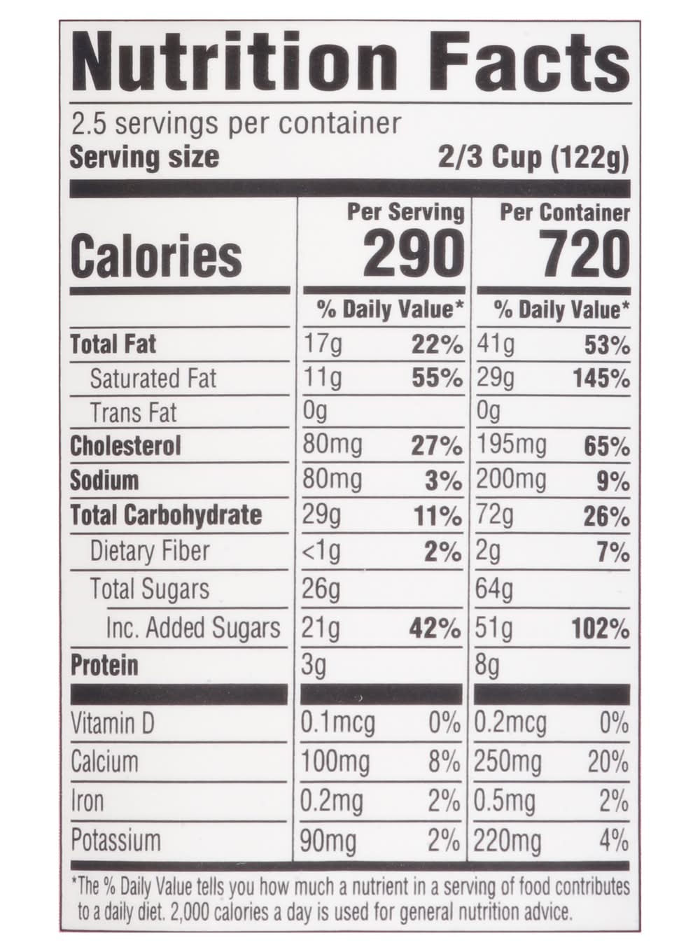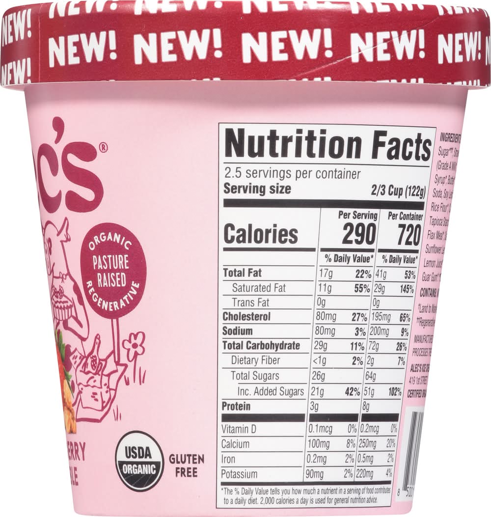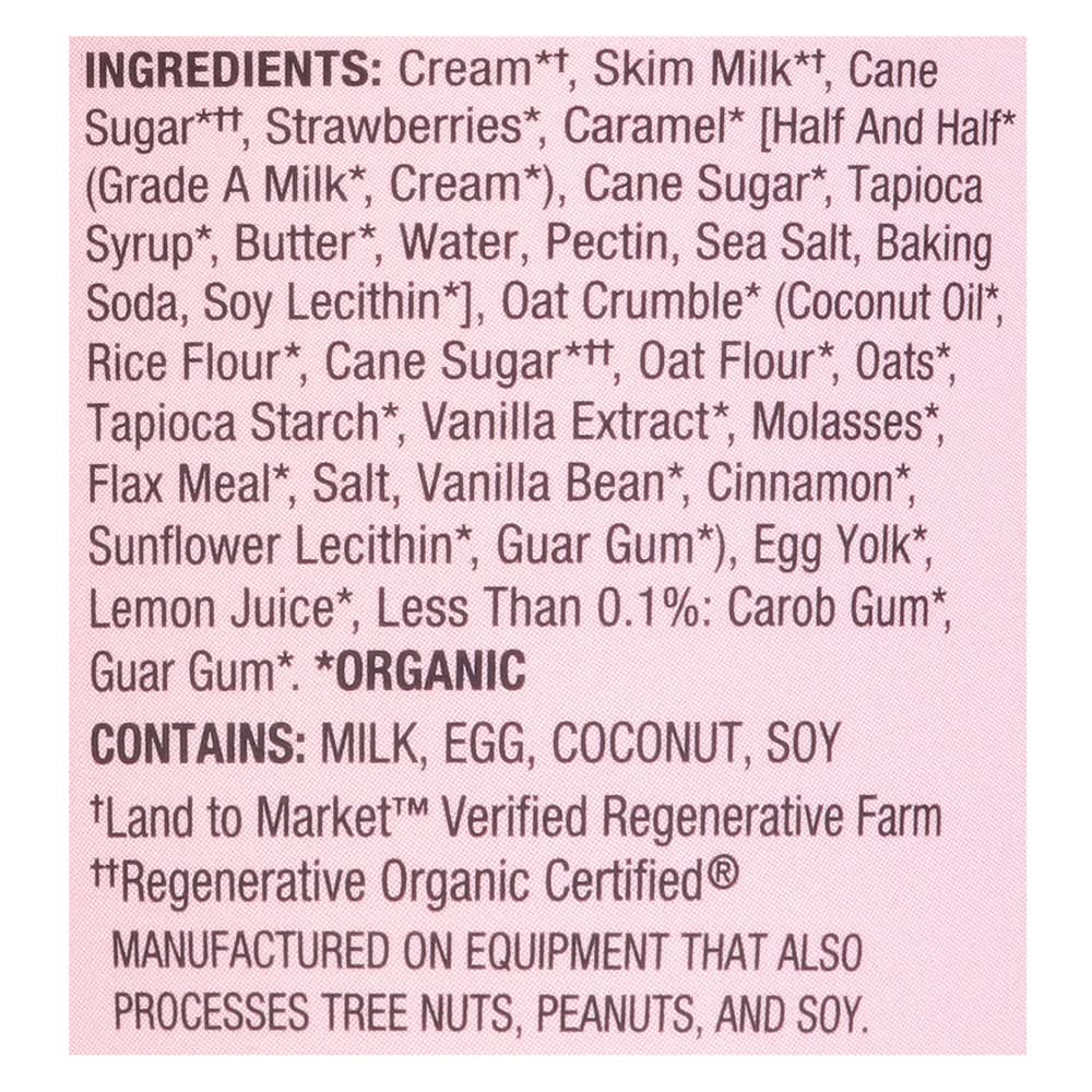 Ingredients: Cream (Organic) (Land to Market Verified Regenerative Farm), Skim Milk(Organic) (Land to Market Verified Regenerative Farm), Cane Sugar(Organic) (Regenerative Organic Certified), Strawberries(Organic), Caramel(Organic) [Half and Half(Organic) (Grade A Milk (Organic), Cream(Organic)), Cane Sugar(Organic), Tapioca Syrup(Organic), Butter(Organic), Water, Pectin, Sea Salt, Baking Soda, Soy Lecithin(Organic)], Oat Crumble(Organic) (Coconut Oil (Organic), Rice Flour (Organic), Cane Sugar (Organic) (Regenerative Organic Certified), Oat Flour (Organic), Oats(Organic), Tapioca Starch (Organic), Vanilla Extract (Organic), Molasses (Organic), Flax Meal (Organic) Salt, Vanilla Bean (Organic), Cinnamon (Organic), Sunflower Lecithin (Organic), Guar Gum (Organic)), Egg Yolk(Organic), Lemon Juice (Organic), Less than 0.1%: Carob Gum(Organic), Guar Gum (Organic) Contains: Soybeans, Oat, Tree Nuts, Coconuts, Milk, Eggs