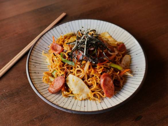 Stir-fried egg noodle, carrot, red bell pepper, cabbage, onion, and kurobuta sausage with spicy yakisoba sauce, bonito flake, nori