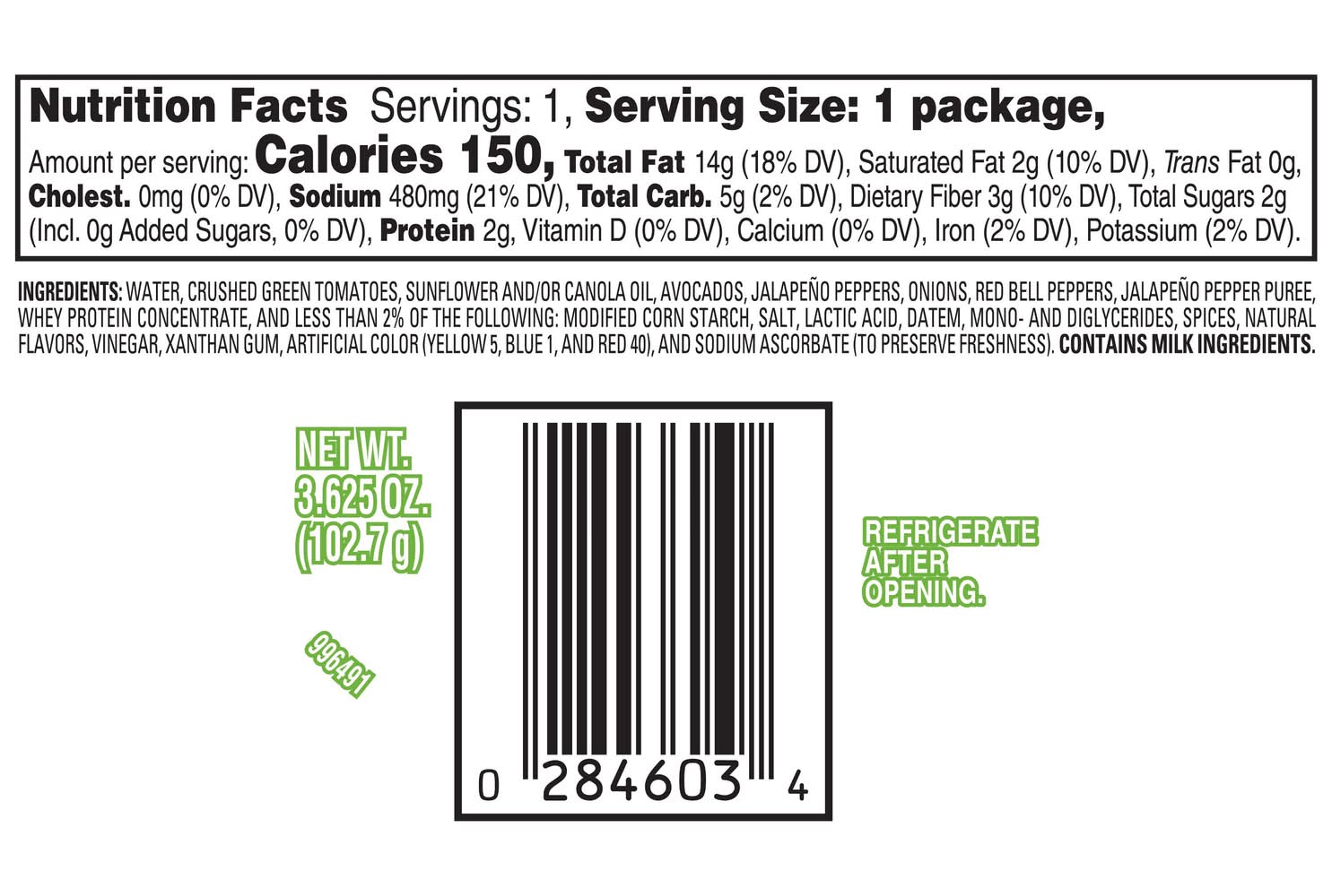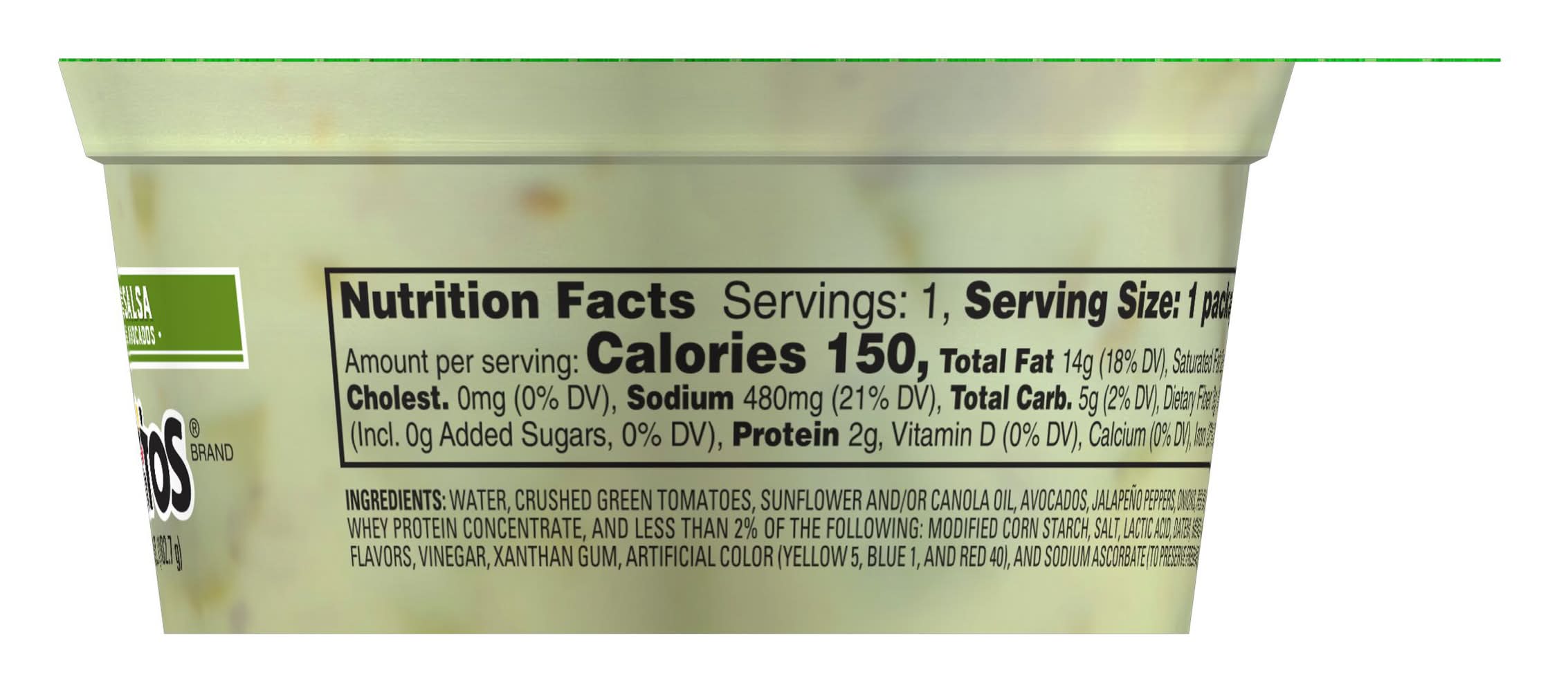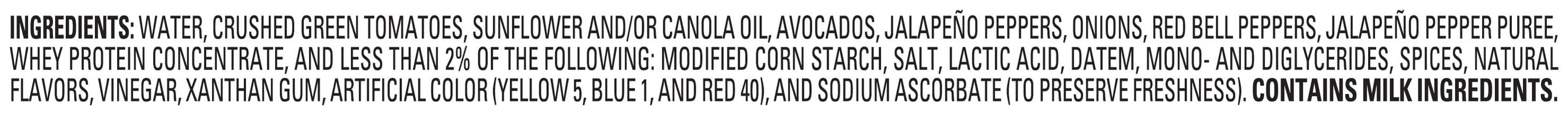 Ingredients: Water, Crushed Green Tomatoes, Sunflower And, Or Canola Oil, Avocados, Jalapeño Peppers, Onions, Red Bell Peppers, Jalapeño Pepper Puree, Whey Protein Concentrate, And Less Than 2% Of The Following: Modified Corn Starch, Salt, Lactic Acid, Datem, Mono- And Diglycerides, Spices, Natural Flavors, Vinegar, Xanthan Gum, Artificial Color (Yellow 5, Blue 1, And Red 40), And Sodium Ascorbate (To Preserve Freshness), . CONTAINS MILK INGREDIENTS. Contains: Contains Milk Ingredients.