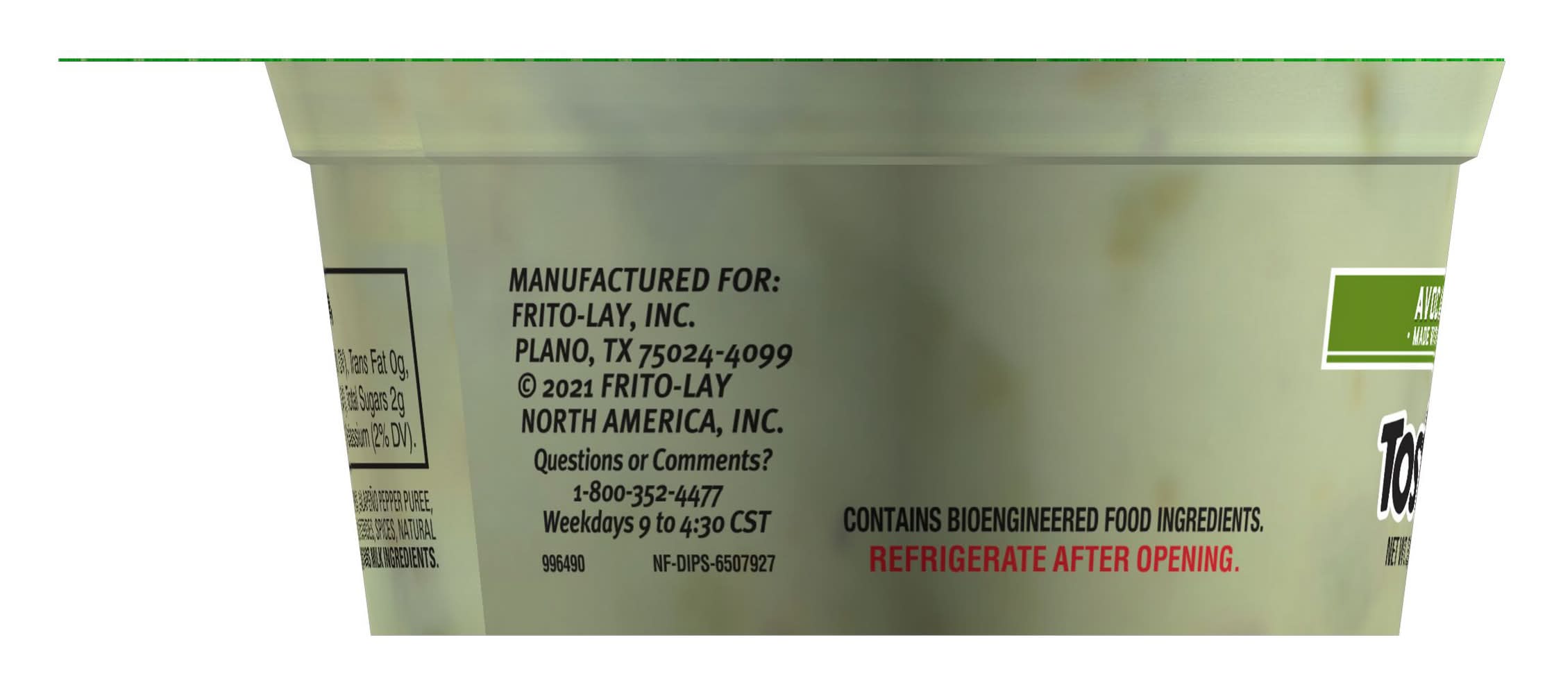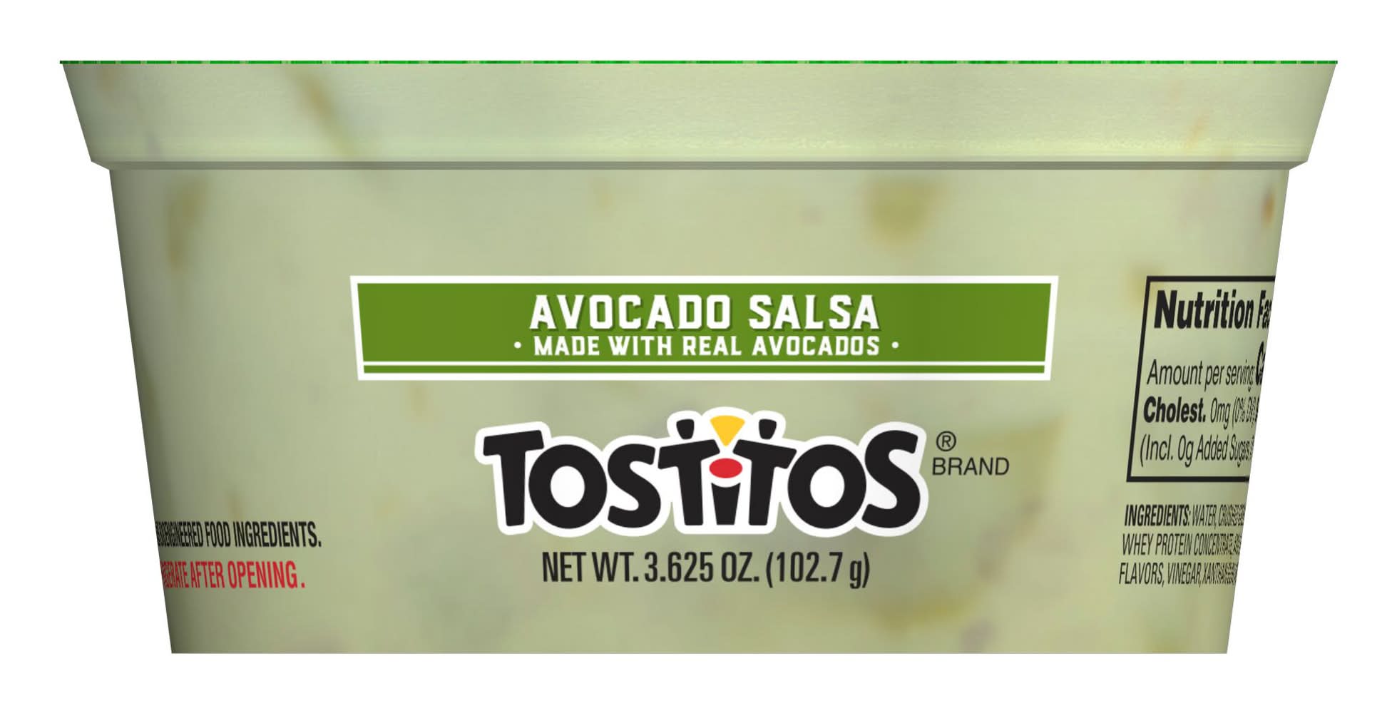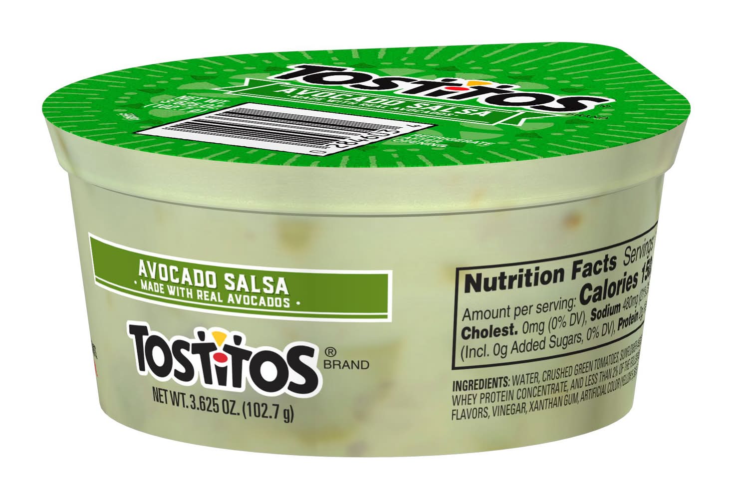 Ingredients: Water, Crushed Green Tomatoes, Sunflower And, Or Canola Oil, Avocados, Jalapeño Peppers, Onions, Red Bell Peppers, Jalapeño Pepper Puree, Whey Protein Concentrate, And Less Than 2% Of The Following: Modified Corn Starch, Salt, Lactic Acid, Datem, Mono- And Diglycerides, Spices, Natural Flavors, Vinegar, Xanthan Gum, Artificial Color (Yellow 5, Blue 1, And Red 40), And Sodium Ascorbate (To Preserve Freshness), . CONTAINS MILK INGREDIENTS. Contains: Contains Milk Ingredients.