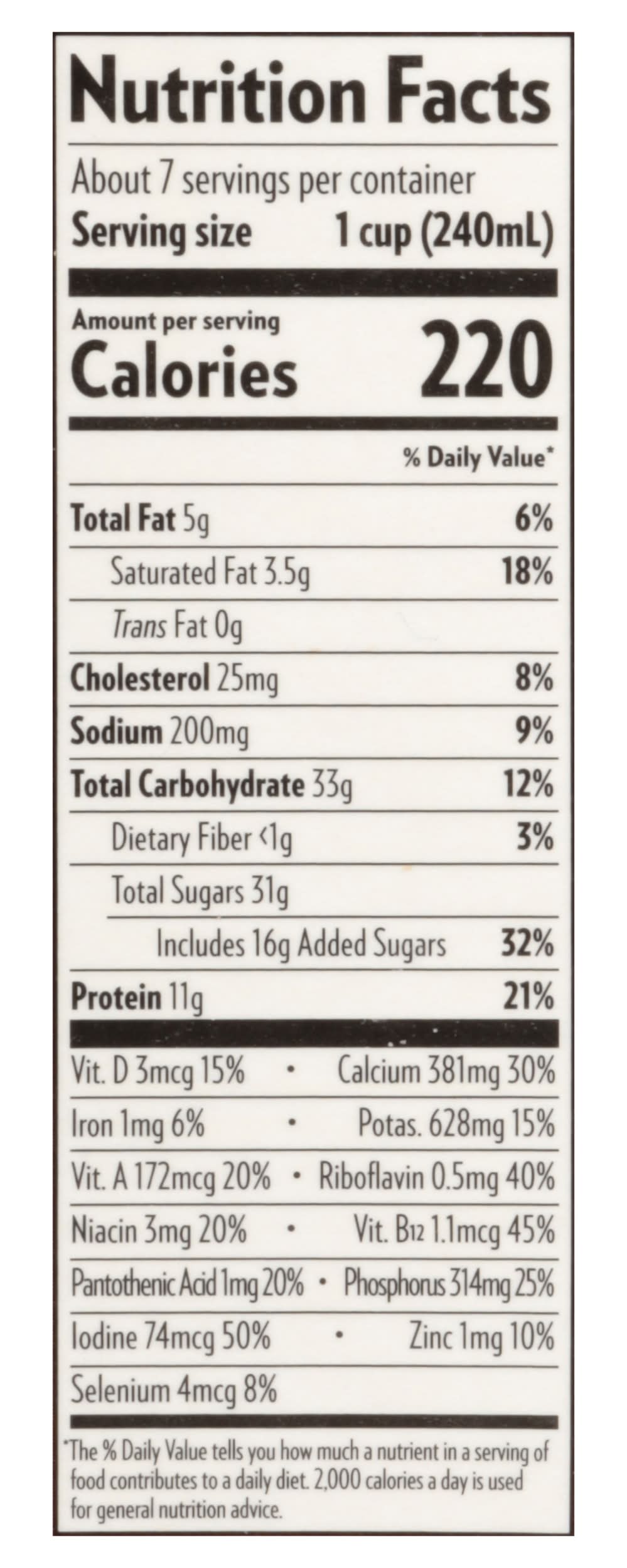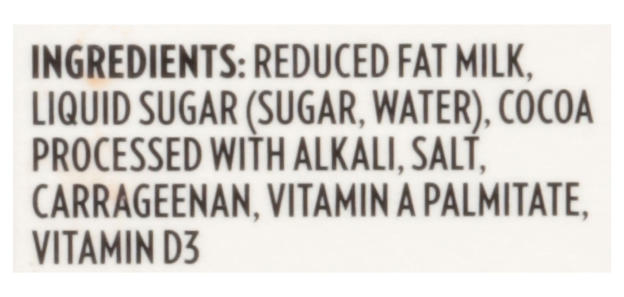 Ingredients: Reduced Fat Milk, Liquid Sugar (Sugar, Water), Cocoa Processed with Alkali, Salt, Carrageenan, Vitamin A Palmitate, Vitamin D3 Contains: Milk