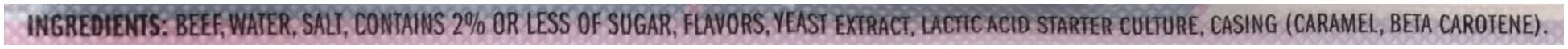 Ingredients: Beef, Water, Salt, Contains 2% or Less of Flavors, Yeast Extract, Lactic Acid Starter Culture, Casing (Caramel Beta Carotene)