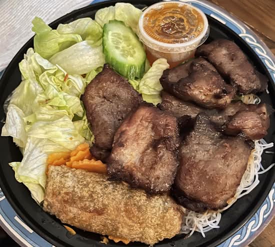 Rice noodle, pickle carrot, lettuce, cucumber with a scrumptiou. Vietnamese traditional noodle sauce. Served with a pork spring roll.