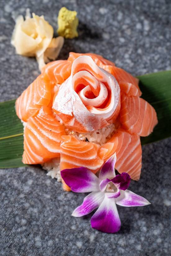 12 pc of fresh salmon sashimi on bed of sushi rice.
