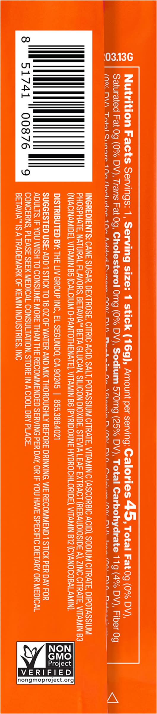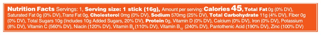 Ingredients: Cane Sugar, Dextrose, Citric Acid, Salt, Potassium Citrate, Vitamin C (Ascorbic Acid), Sodium Citrate, Dipotassium Phosphate, Natural Flavors, Betavia Beta Glucan, Silicon Dioxide, Stevia Leaf Extract (Rebaudioside a), Zinc Citrate, Vitamin B3 (Niacinamide), Vitamin B5 (Calcium D-Pantothenate), Vitamin B6 (Vitamin B6 (Pyridoxine Hydrochloride), Vitamin B12 (Cyanocobalamin)