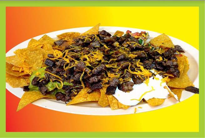 With cheese, guacamole, sour cream, beans, Mexican salsa, and meat.