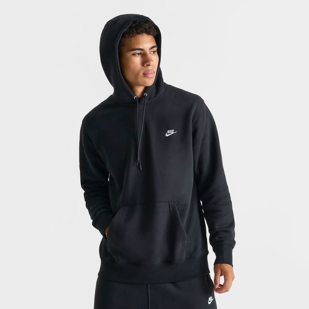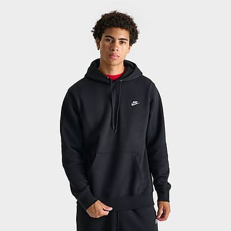 Size & FitStandard fit is athletic and relaxedProduct FeaturesPullover design with a drawcord-adjustable, double-layered hood for optional coverage. Midweight brushed fleece feels extra soft on the inside and smooth on the outside. Embroidered Nike Futura logo at the left chest delivers classic heritage style. Round braided drawcords and hardware eyelets on the hood equip a premium vibe. Large front kangaroo pocket provides space to stash on-the-go essentials and shelter for cold hands. Ribbed sleeve cuffs and hem streamline the fit and seal out the elements. 67-81% cotton, 19-33% polyester. Check label for actual percentages. Machine wash. The Nike Club Fleece Premium Embroidered Pullover Hoodie is imported. Crisp, clean sportswear style links up with unbeatable comfort on the Men's Nike Club Fleece Premium Embroidered Pullover Hoodie. Super-soft midweight blended Club Fleece fabric with minor tweaks like a braided drawcord and hardware eyelets evolves and elevates the fan-favorite Club Fleece hoodie to new heights, proving to be the ultimate everyday hoodie you can throw on in a pinch to guarantee timeless good looks while staying cozy and comfortable. | Nike Men's Club Fleece Premium Embroidered Pullover Hoodie in Black/White | Size: Large • Color: Black/black/white • Size: Large • male