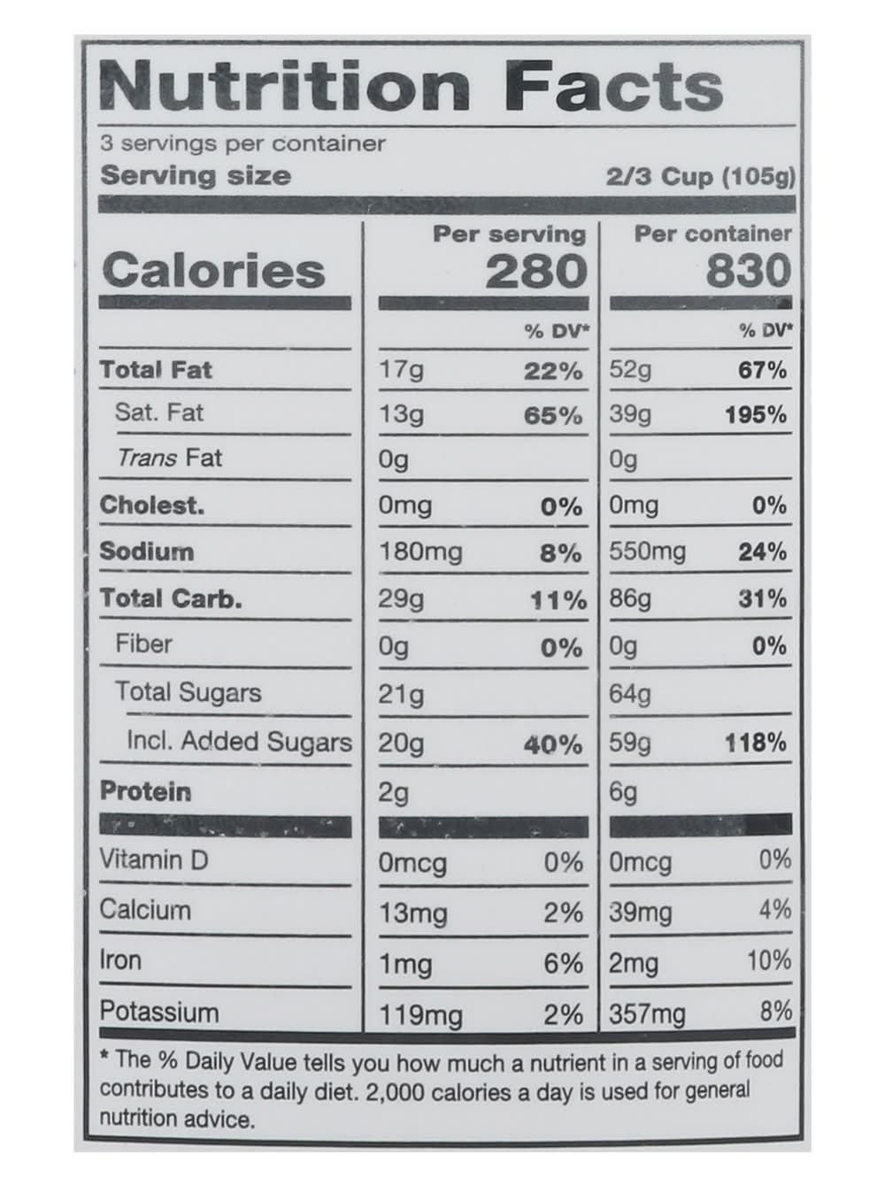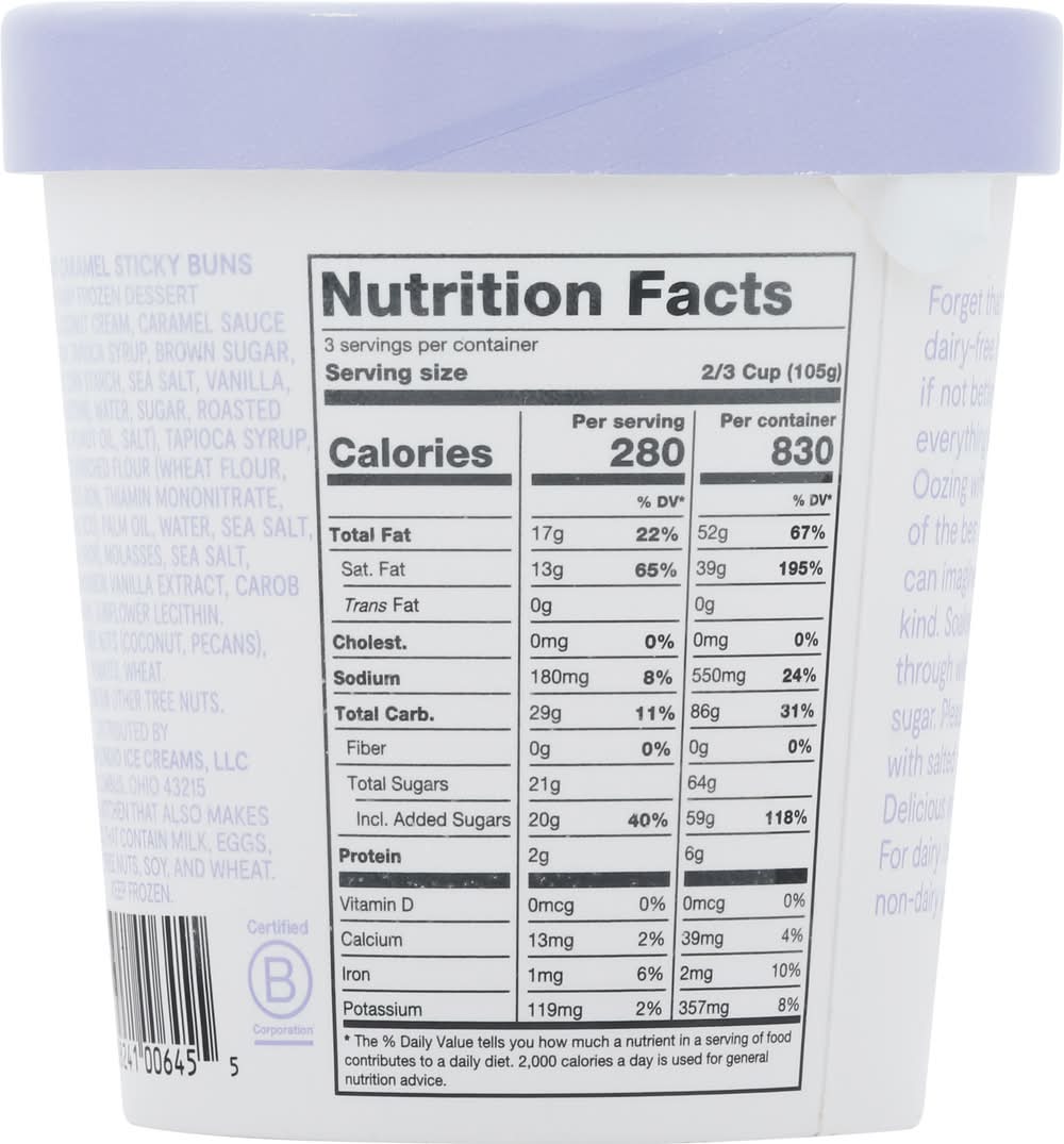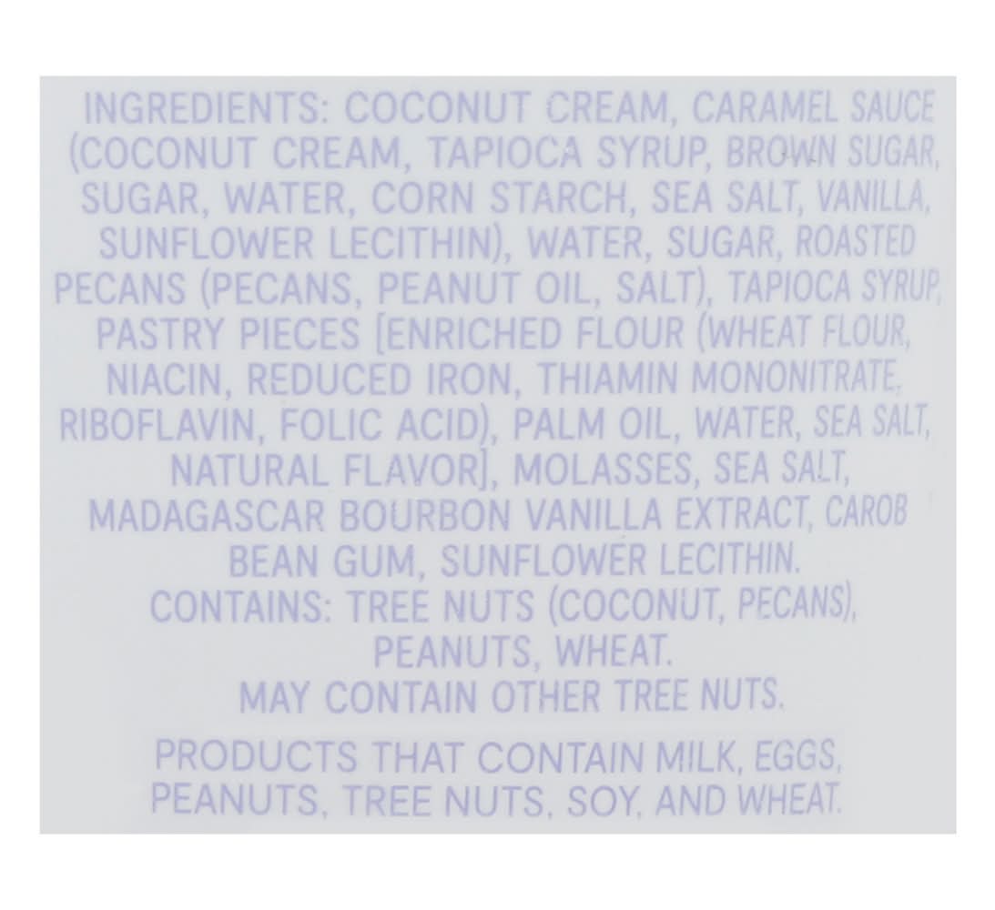 Ingredients: Coconut Cream, Caramel Sauce (Coconut Cream, Tapioca Syrup, Brown Sugar, Sugar, Water, Corn Starch, Sea Salt, Vanilla, Sunflower Lecithin), Water, Sugar, Roasted Pecans (Pecans, Peanut Oil, Salt), Tapioca Syrup Pastry Pieces [Enriched Flour (Wheat Flour, Niacin, Reduced Iron, Thiamin Mononitrate, Riboflavin, Folic Acid), Palm Oil, Water, Sea Salt, Natural Flavor], Molasses, Sea Salt, Madagascar Bourbon Vanilla Extract, Carob Bean Gum, Sunflower Lecithin Contains: Tree Nuts, Peanuts, Wheat, Milk, Eggs, Soybeans