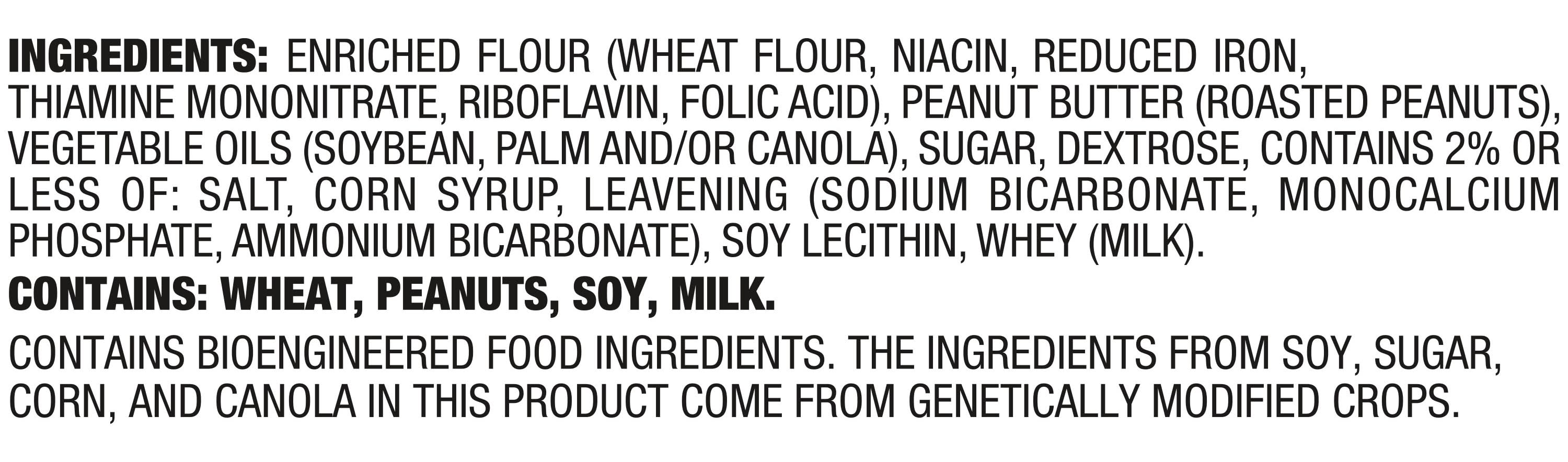 Ingredients: INGREDIENTS: ENRICHED FLOUR (WHEAT FLOUR, NIACIN, REDUCED IRON, THIAMINE MONONITRATE, RIBOFLAVIN, FOLIC ACID), PEANUT BUTTER (ROASTED PEANUTS), VEGETABLE OILS (SOYBEAN, PALM AND/OR CANOLA), SUGAR, DEXTROSE, CONTAINS 2% OR LESS OF: SALT, CORN SYRUP, LEAVENING (SODIUM BICARBONATE, MONOCALCIUM PHOSPHATE, AMMONIUM BICARBONATE), SOY LECITHIN, WHEY (MILK), . CONTAINS: WHEAT, PEANUTS, SOY, MILK. Contains: CONTAINS: Gluten, Milk/Dairy, Peanut, Soybean, Wheat
