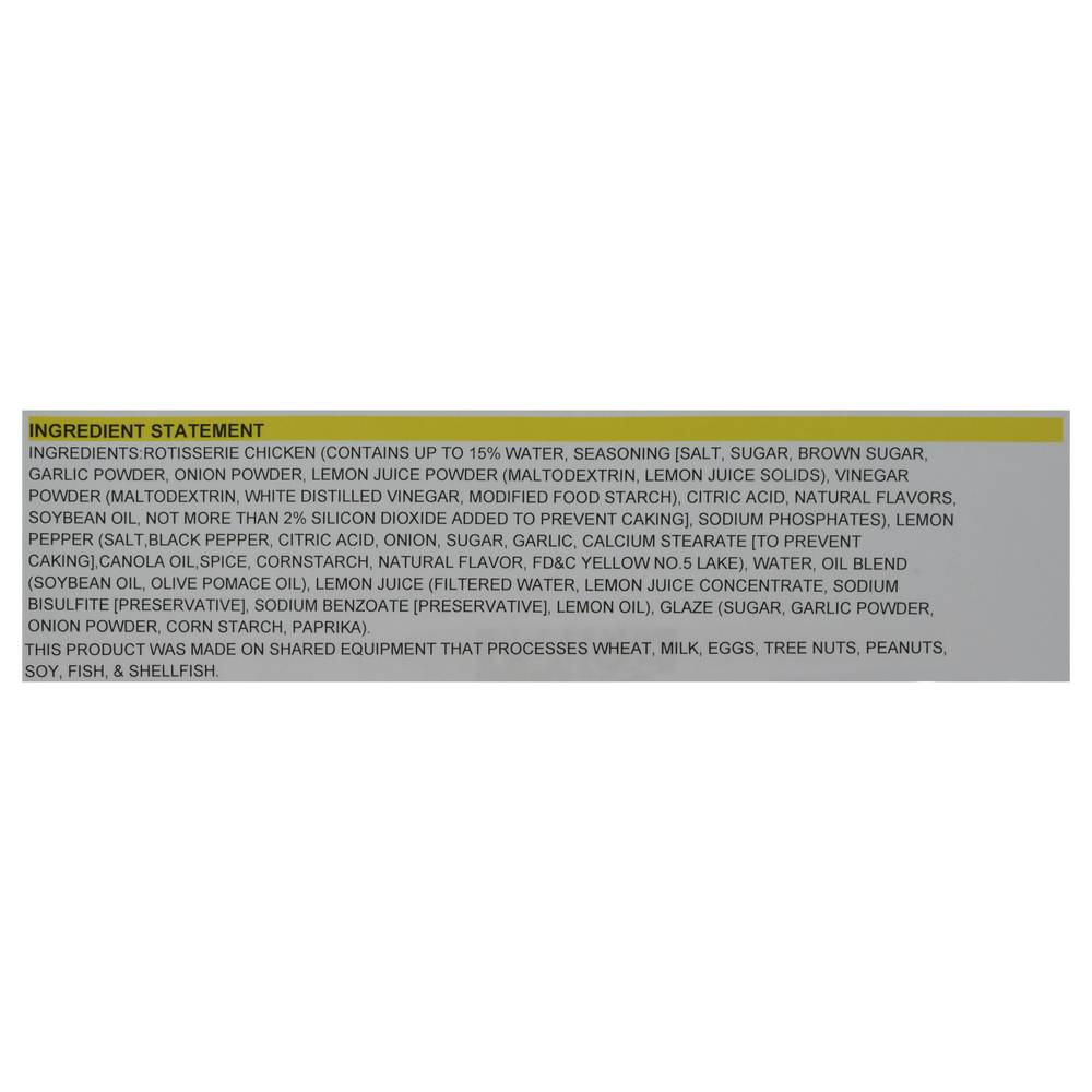 Ingredients: Rotisserie Chicken (Contains Up to 15% Water, Seasoning [Salt, Sugar, Brown Sugar, Garlic Powder, Onion Powder, Lemon Juice Powder (Maltodextrin, Lemon Juice Solids), Vinegar Powder (Maltodextrin, White Distilled Vinegar, Modified Food Starch), Citric Acid, Natural Flavors, Soybean Oil, Not More than 2% Silicon Dioxide Added to Prevent Caking], Sodium Phosphates), Lemon Pepper (Salt, Black Pepper, Citric Acid, Onion, Sugar, Garlic, Calcium Stearate [to Prevent Caking], Canola Oil, Spice, Cornstarch, Natural Flavor, FD&C Yellow No.5 Lake), Water, Oil Blend (Soybean Oil, Olive Pomace Oil), Lemon Juice (Filtered Water, Lemon Juice Concentrate, Sodium Bisulfite [Preservative], Sodium Benzoate [Preservative], Lemon Oil), Glaze (Sugar, Garlic Powder, Onion Powder, Corn Starch, Paprika). Contains: Wheat, Milk, Eggs, Tree Nuts, Peanuts, Soybeans, Fish, Crustacean Shellfish
