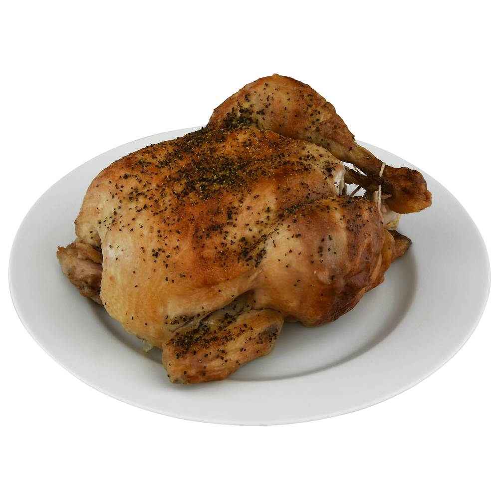 Indulge in the savory flavors of Market Hot Lemon Pepper Rotisserie Chicken, freshly prepared and ready to enjoy. Seasoned with a zesty blend of lemon and black pepper, this rotisserie chicken offers a perfect balance of citrusy tang and spicy warmth. It is cooked to golden-brown perfection, ensuring a crispy exterior and a juicy, tender interior. Ideal for a convenient meal option, this chicken serves as a delicious centerpiece for any dining occasion. Size: OZ 37