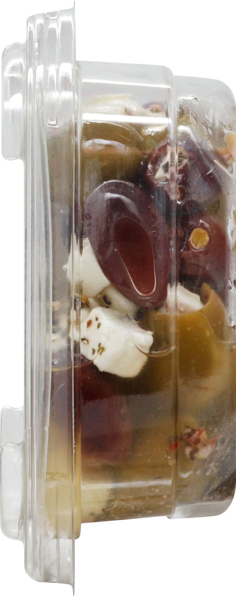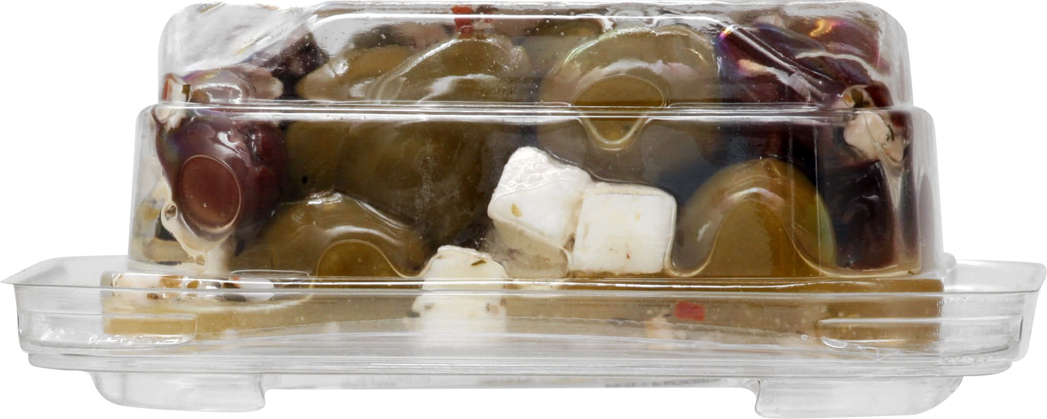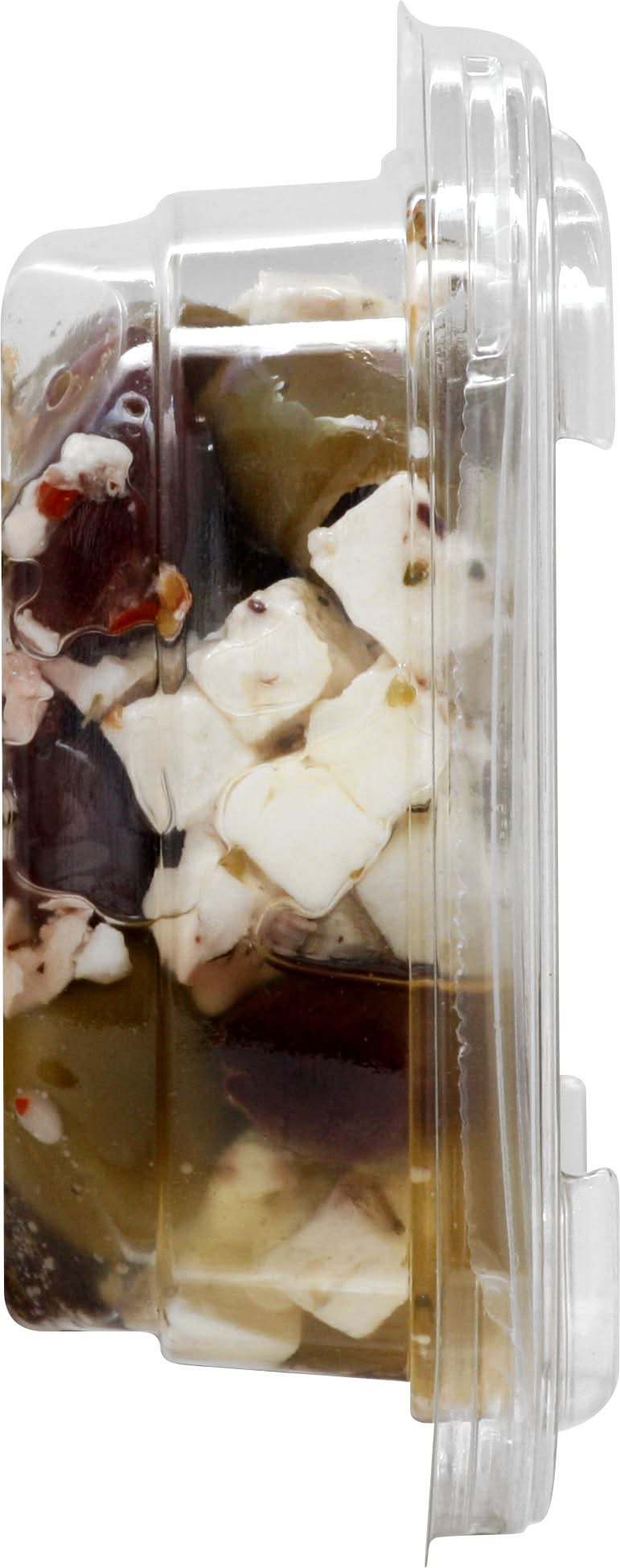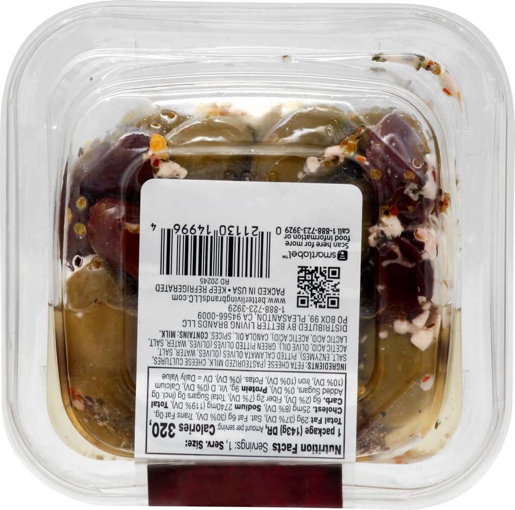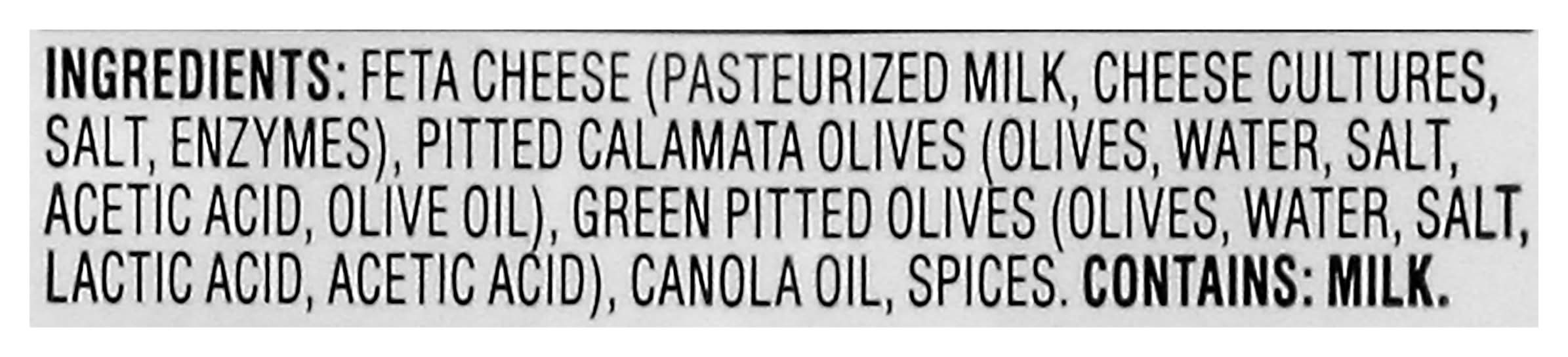 Ingredients: Feta Cheese (Pasteurized Milk, Cheese Cultures, Salt, Enzymes), Pitted Calamata Olives (Olives, Water, Salt, Acetic Acid, Olive Oil), Green Pitted Olives (Olives, Water, Salt, Lactic Acid, Acetic Acid), Canola Oil, Spices. Contains: Milk