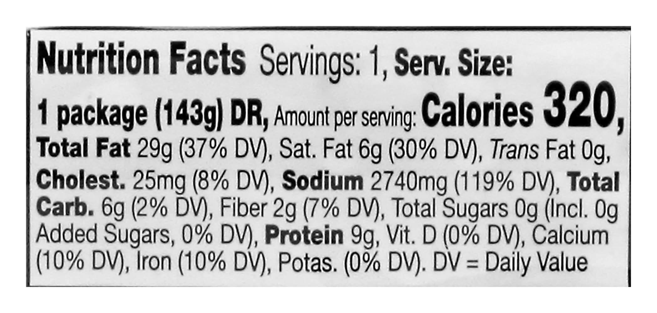 Per 1 Package: 320 calories; 6 g sat fat (30% DV); 2740 mg sodium (119% DV); 0 g total sugars. www.betterlivingbrandsLLC.com. SmartLabel: Scan for more information of call 1-888-723-3929. Packed in USA. Better Living Brands LLC, PO Box 99, Pleasanton, CA, 94566-0009