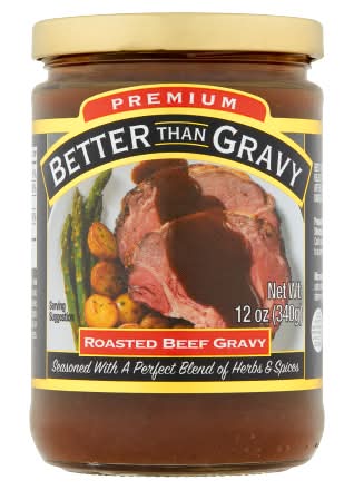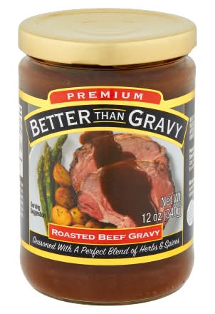Ingredients: Beef Stock, Modified Food Starch, Better Than Bouillon Beef Base (Roasted Beef with Concentrated Beef Stock, Salt, Hydrolyzed Soy Protein, Sugar, Corn Syrup Solids, Flavoring, Whey, Potato Flour, Contains 2% or Less of Yeast Extract, Caramel Color, Corn Oil, Xanthan Gum), Nonfat Dry Milk, Contains 2% or Less of Unsalted Butter (Cream), Red Wine Vinegar, Caramel Color, Spices, Garlic, Onion Contains: Dairy, Lactose, Milk, Soy