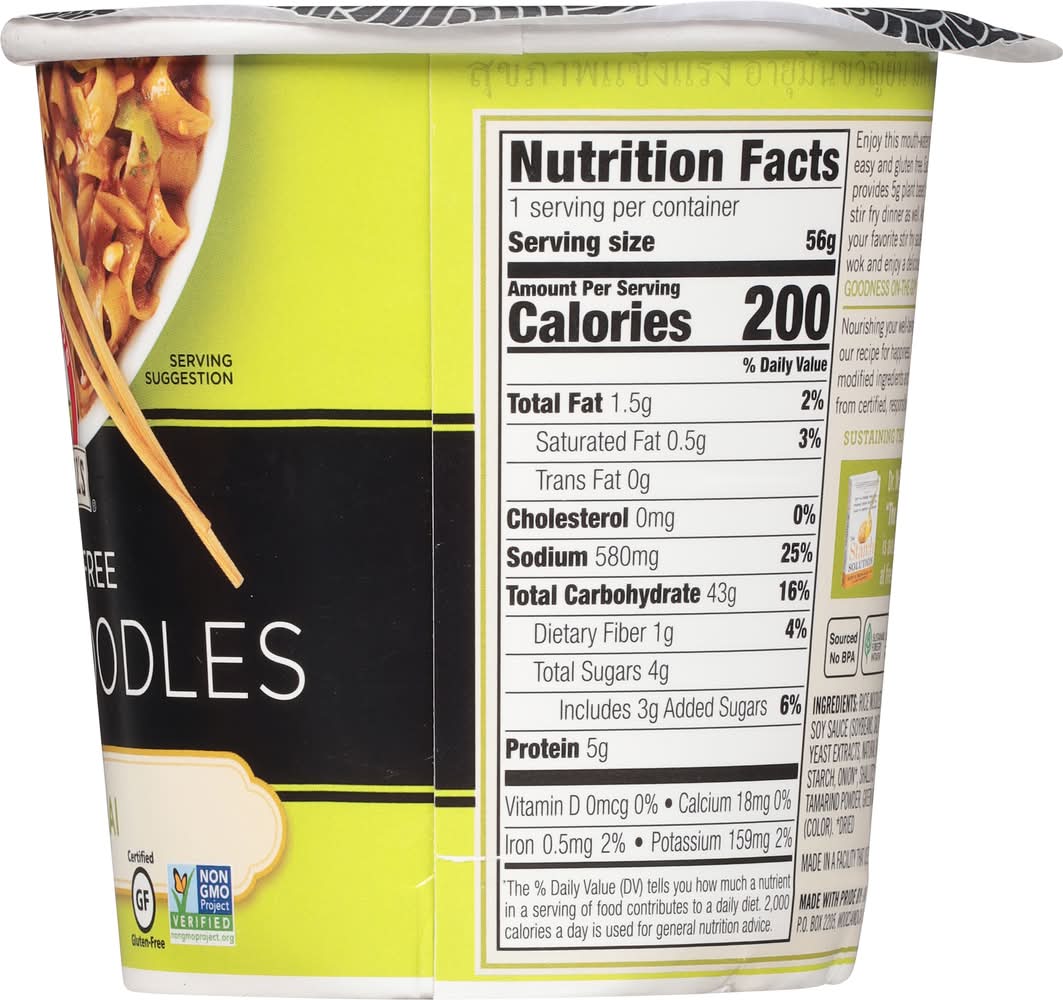 Ingredients: Rice Noodles (Rice, Starch), Tamari Gluten Free Soy Sauce (Soybeans, Salt) (Dried), Peanuts, Organic Sugar, Garlic (Dried), Yeast Extracts, Natural Flavors, Lime Juice Powder, Potato Starch, Onion (Dried), Shallots (Dried), Cabbage (Dried), Cilantro (Dried), Spices, Tamarind Powder, Green Onion (Dried), Turmeric & Paprika Oleoresin (Color) Contains: Soybeans, Peanuts, Peanuts