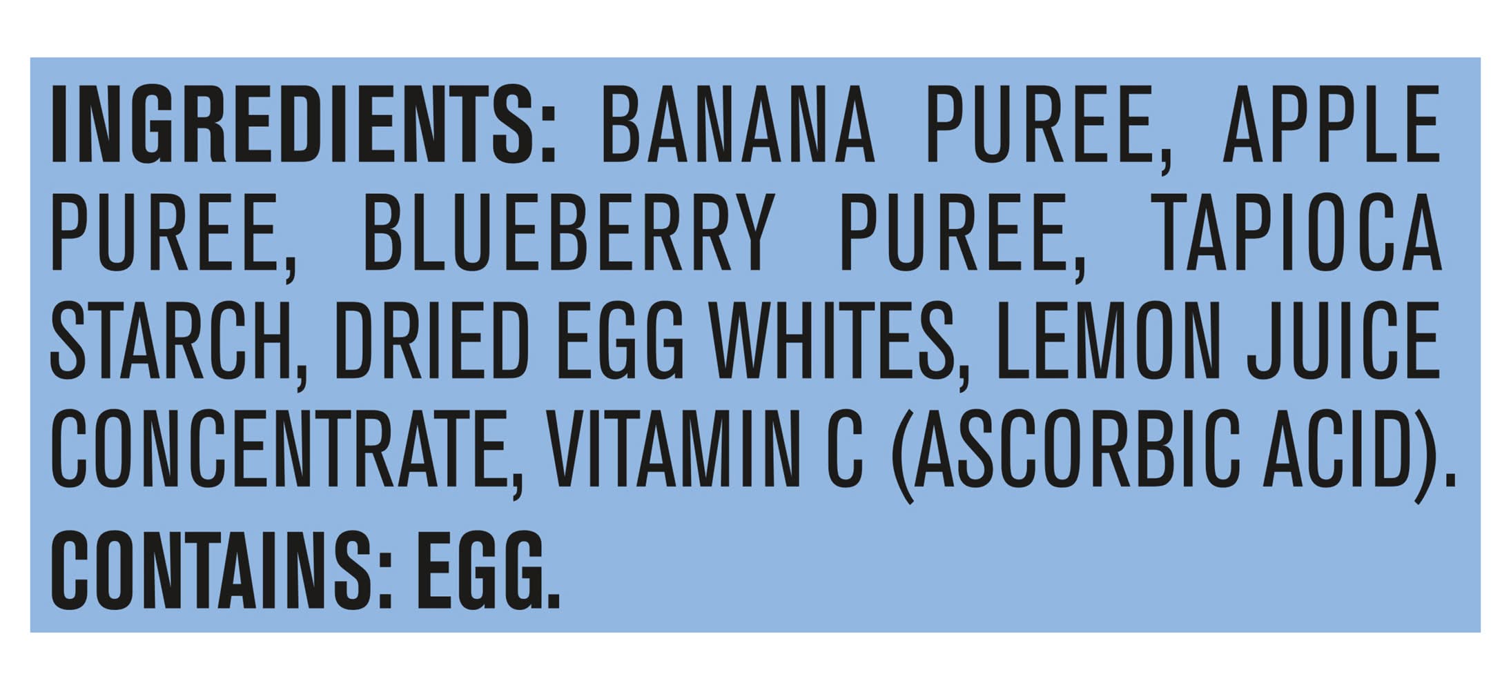 Ingredients: Banana Puree, Apple Puree, Blueberry Puree, Tapioca Starch, Dried Egg Whites, Lemon Juice Concentrate, Vitamin C (Ascorbic Acid) Contains: Eggs