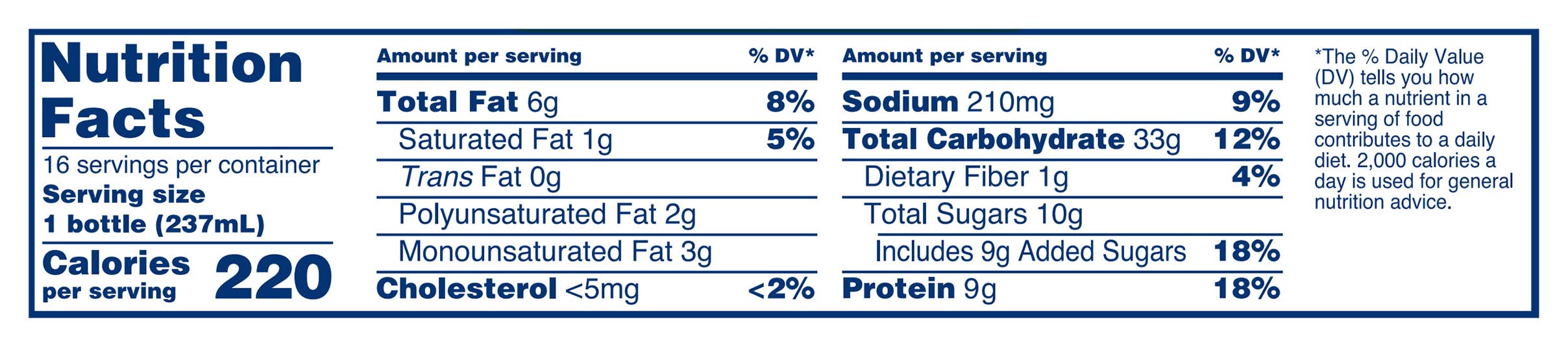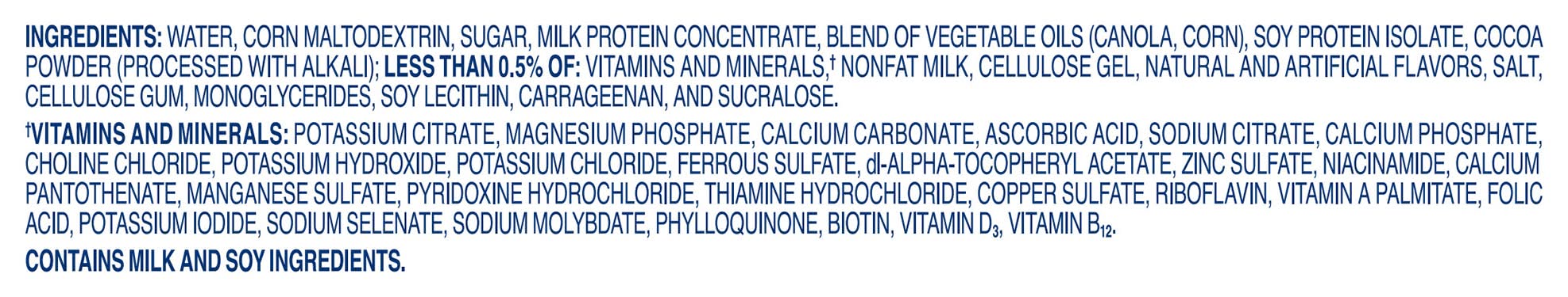 Ingredients: Water, Corn Maltodextrin, Sugar, Milk Protein Concentrate, Blend of Vegetable Oils (Canola, Corn), Soy Protein Isolate, Cocoa Powder (Processed with Alkali; Less than 0.5% of: Vitamins and Minerals (Vitamins and Minerals: Potassium Citrate, Magnesium Phosphate, Calcium Carbonate, Ascorbic Acid, Sodium Citrate, Calcium Phosphate, Choline Chloride Potassium Hydroxide, Potassium Chloride, Ferrous Sulfate, DL-Alpha-Tocopheryl Acetate, Zinc Sulfate, Niacinamide, Calcium Pantothenate, Manganese Sulfate, Pyridoxine Hydrochloride, Thiamine Hydrochloride, Copper Sulfate, Riboflavin, Vitamin A Palmitate, Folic Acid, Potassium Iodide, Sodium Selenate, Sodium Molybdate, Phylloquinone, Biotin, Vitamin D3, Vitamin B12), Nonfat Milk, Cellulose Gel, Natural and Artificial Flavors, Salt, Cellulose Gum, Monoglycerides, Soy Lecithin, Carrageenan, and Sucralose Contains: Milk, Soybeans, Corn